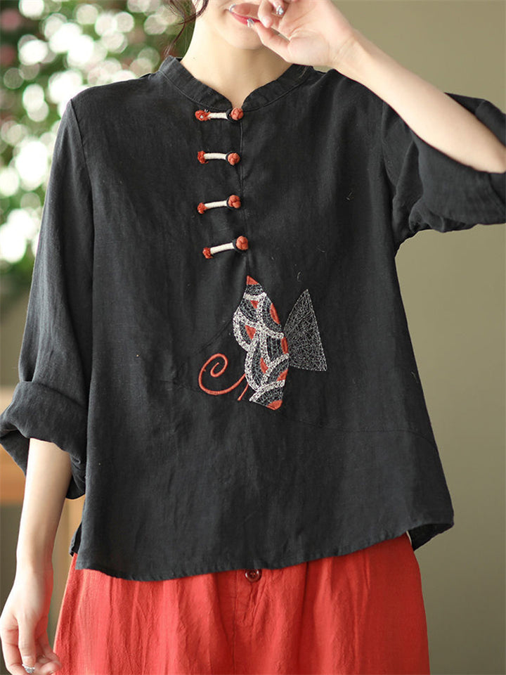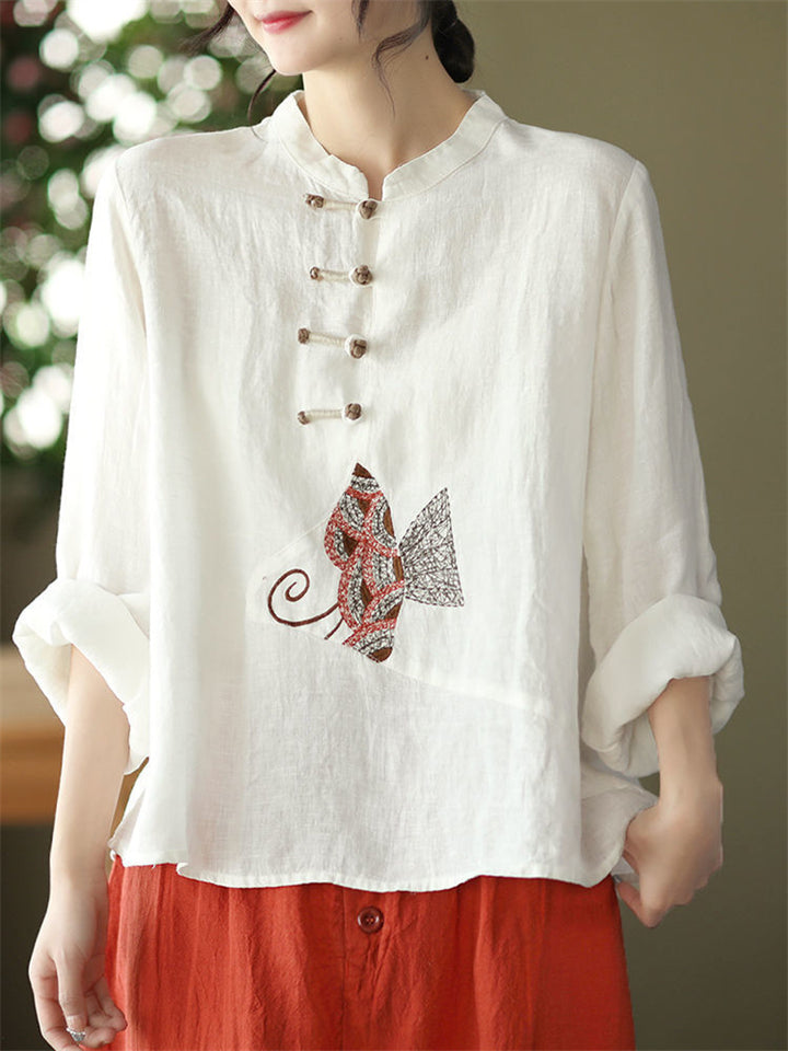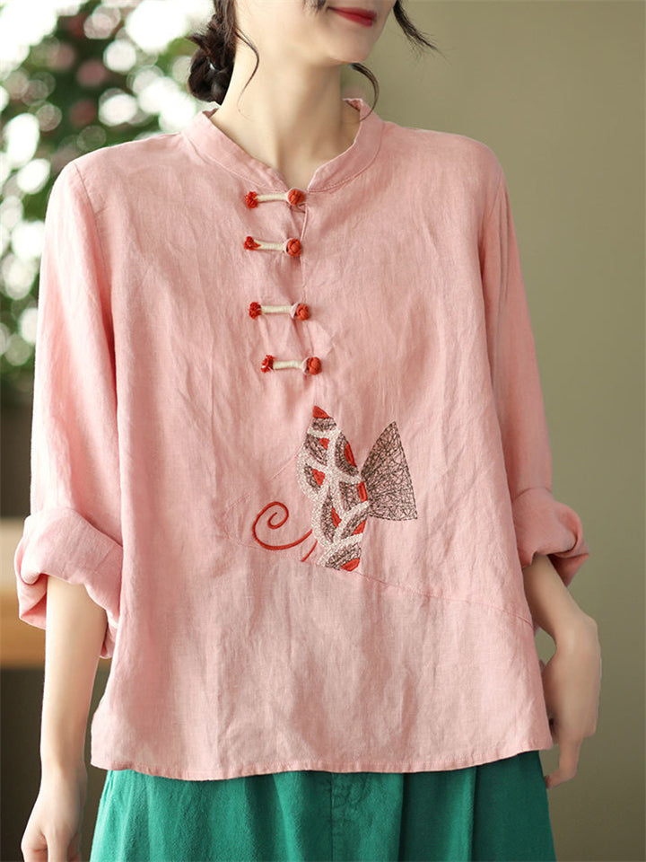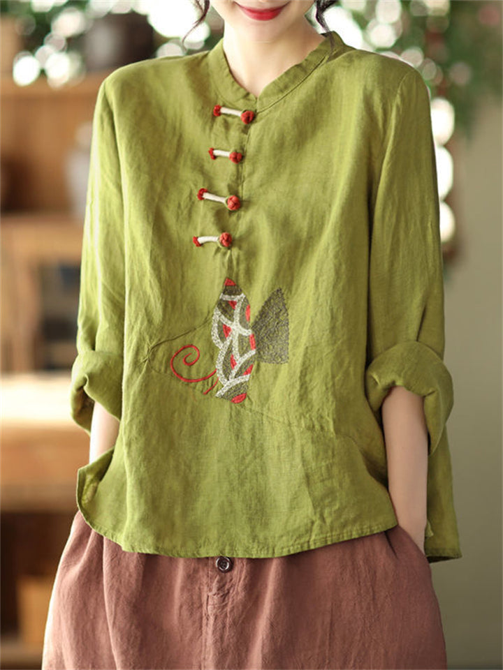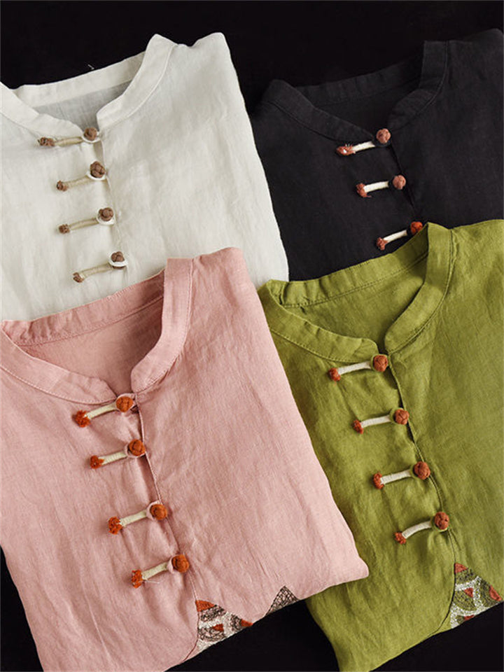 Ancient Chinese Style Floral Embroidery Linen Shirt for Women