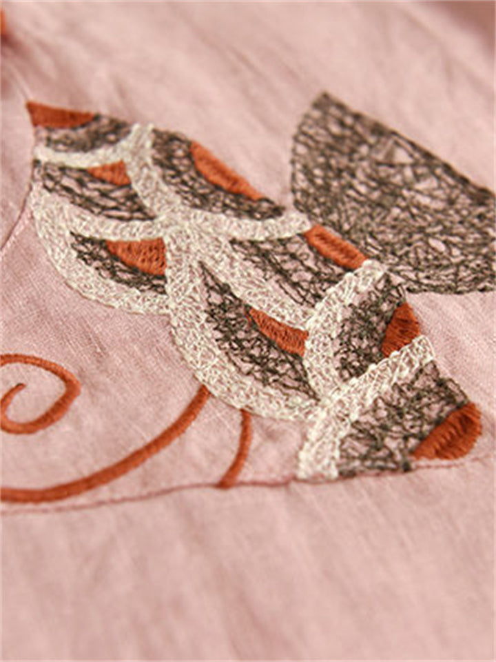 Ladies Ethnic Style Floral Embroidery Round Neck Shirts