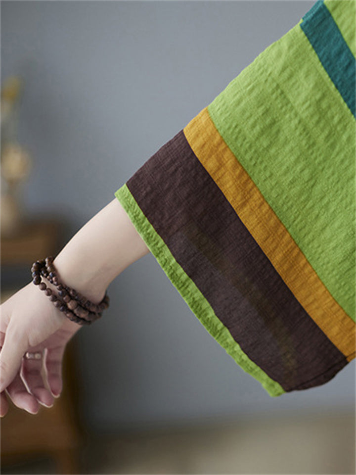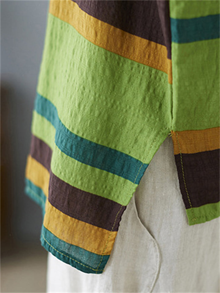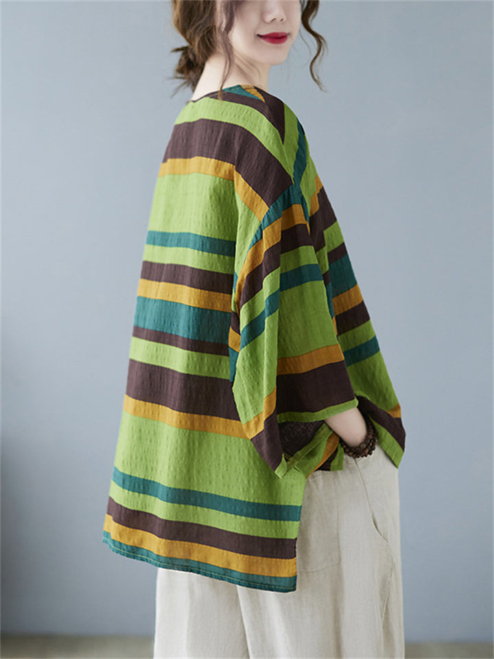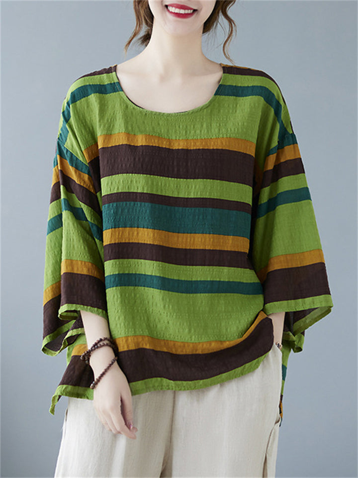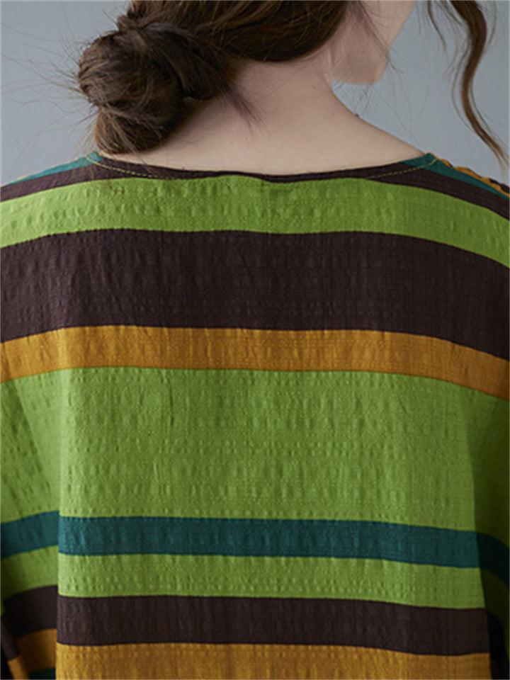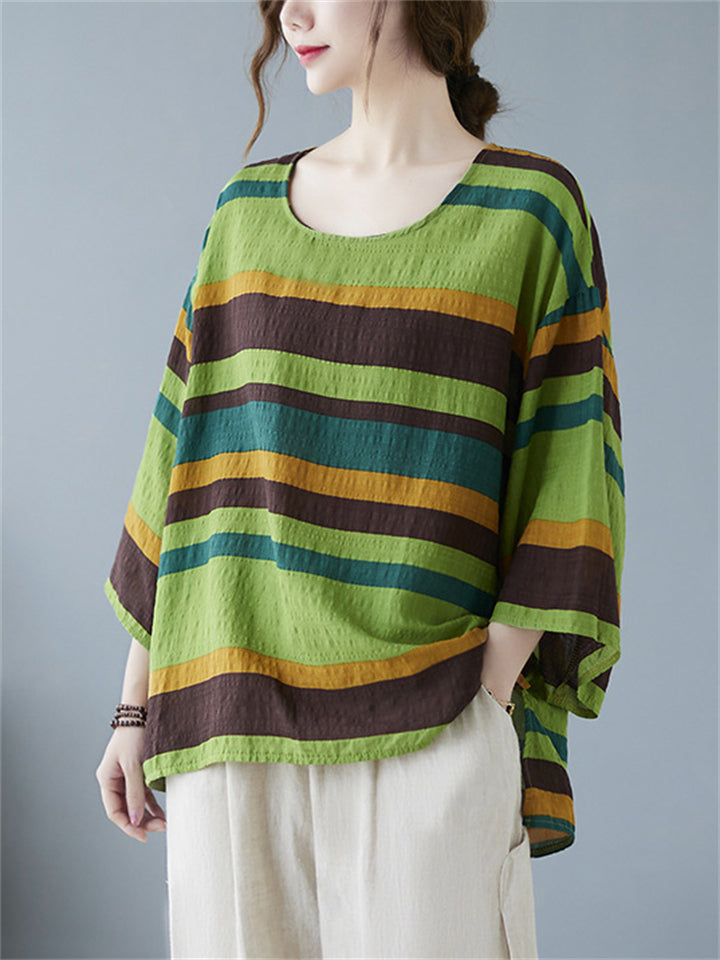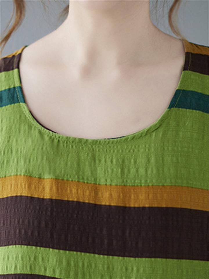 Contrast Color Striped Cotton Linen Scoop Neck T-shirt for Women