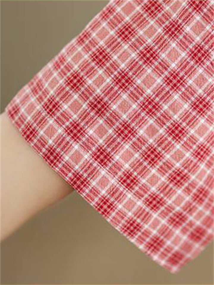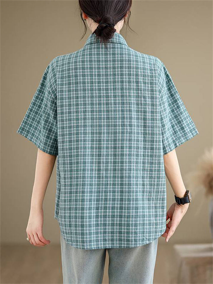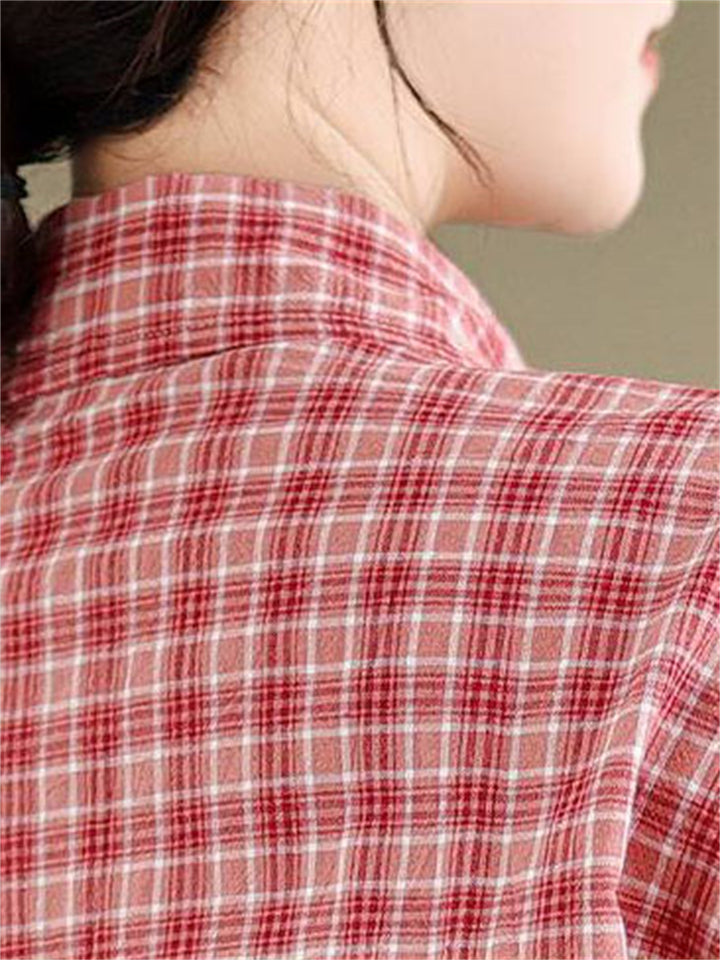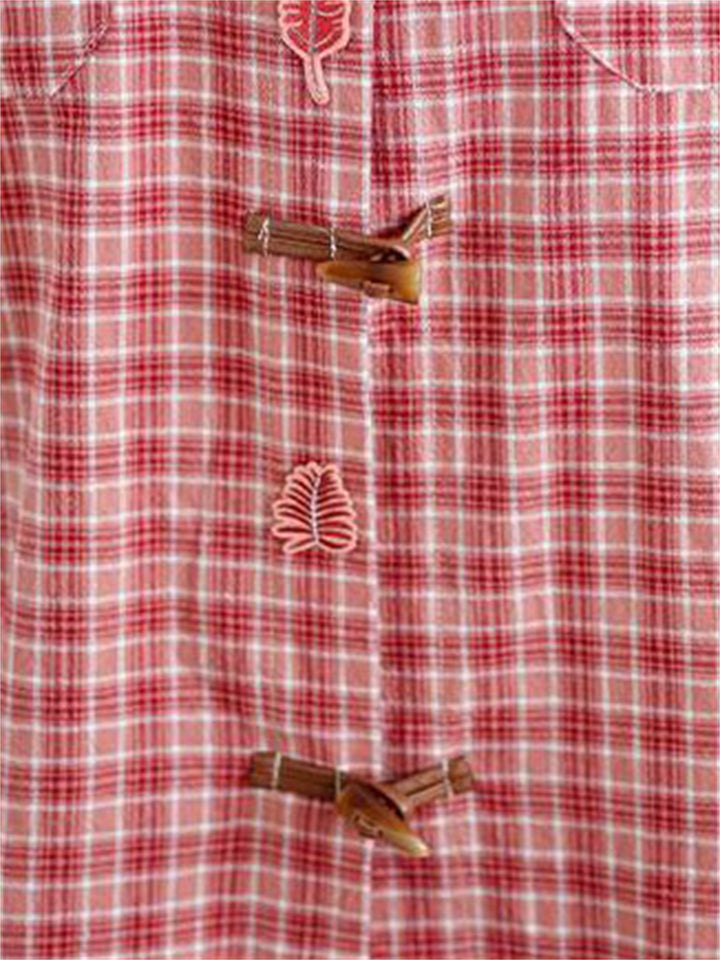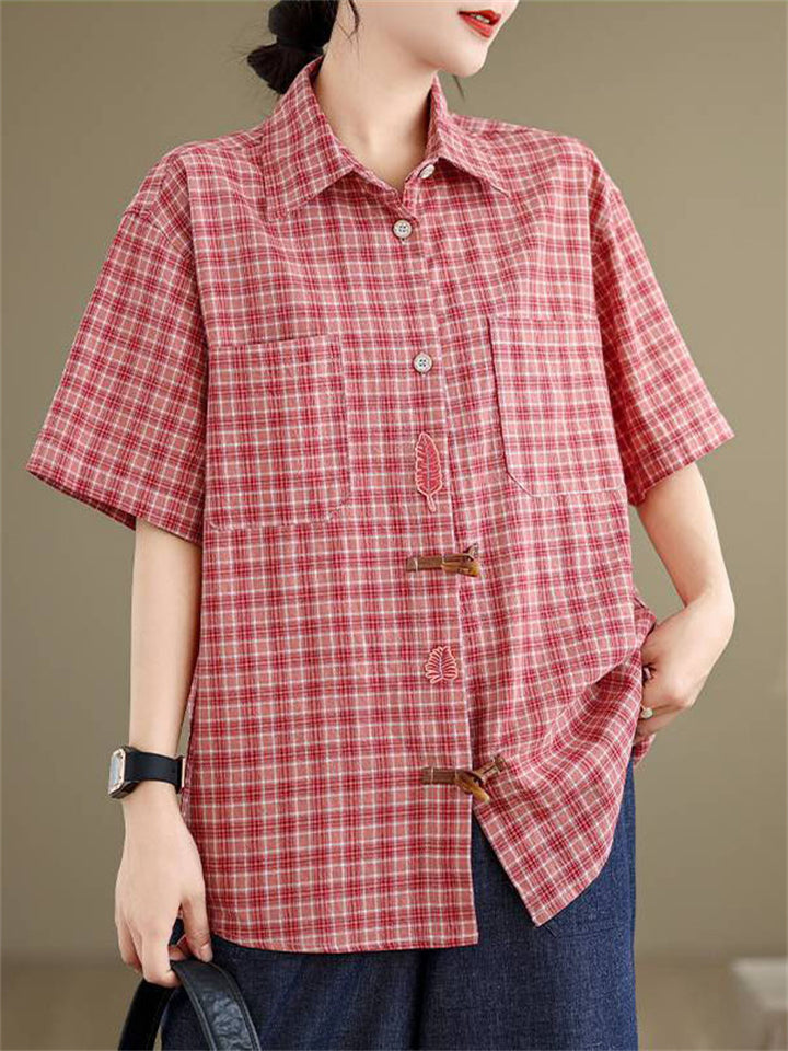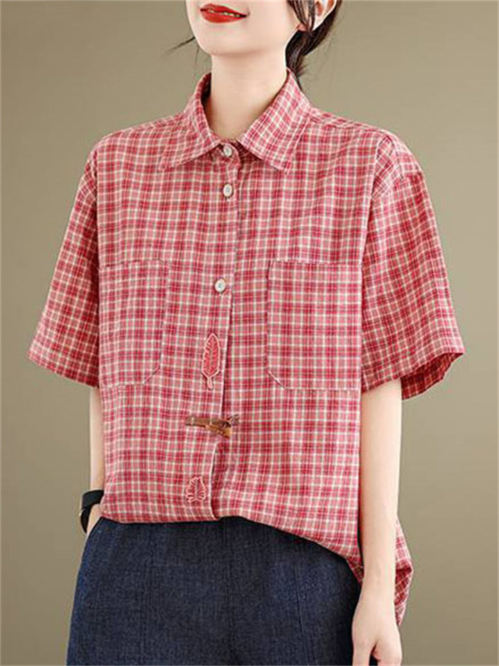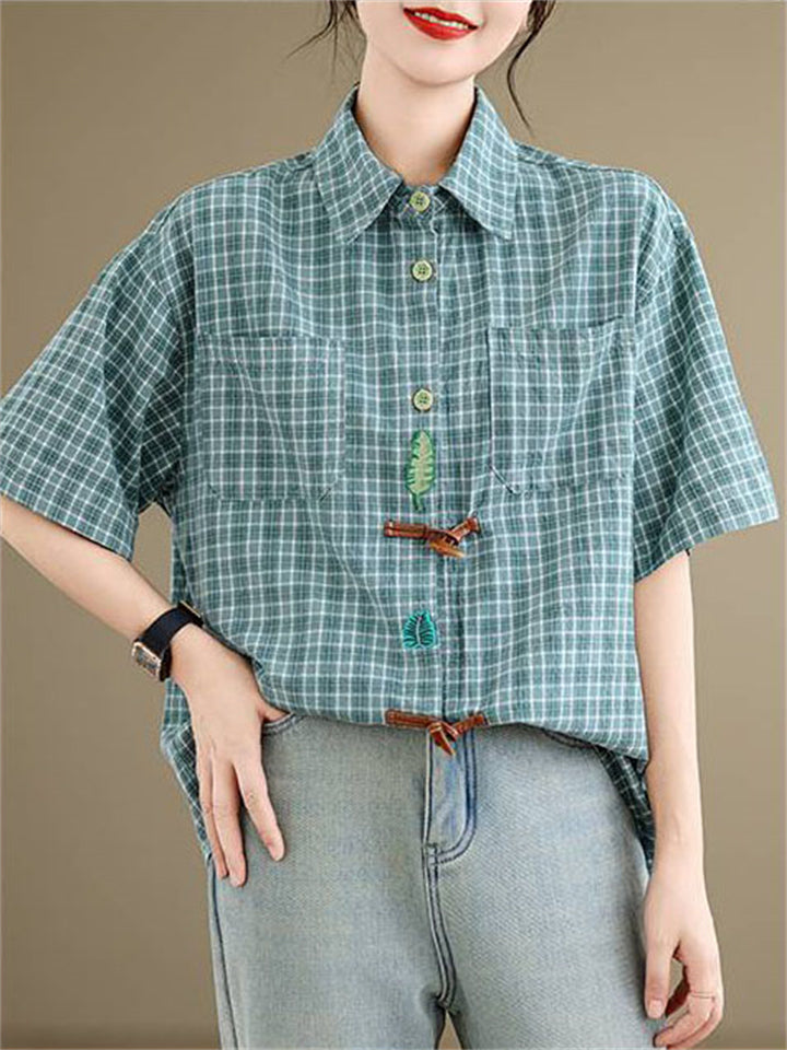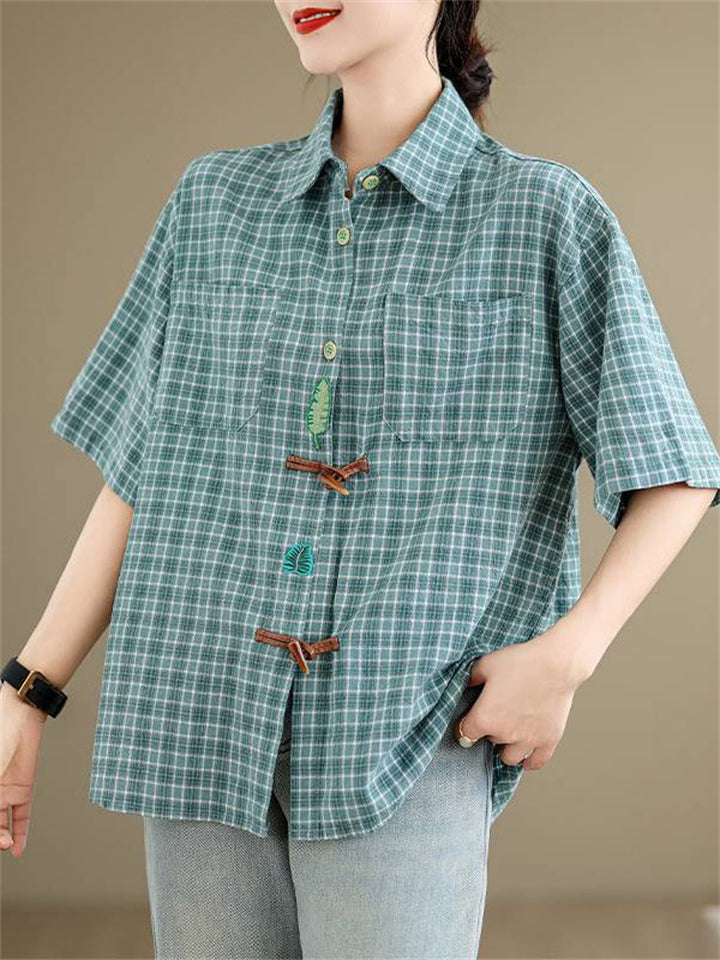 Cute Leaf Patch Button Up Lapel Retro Plaid Shirt for Women