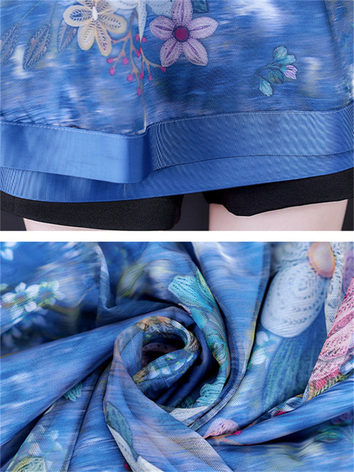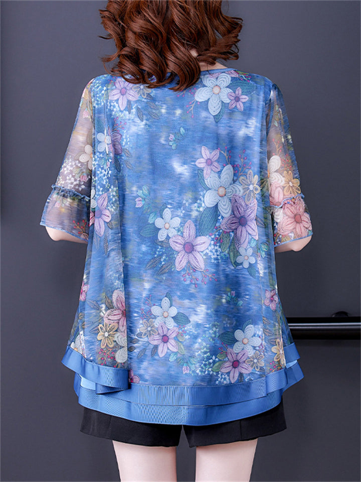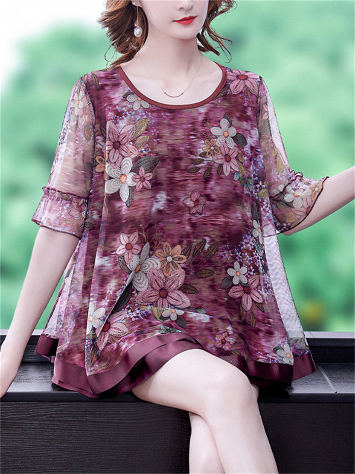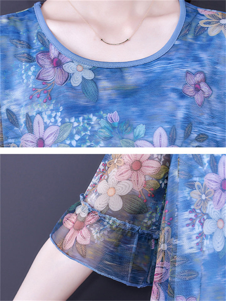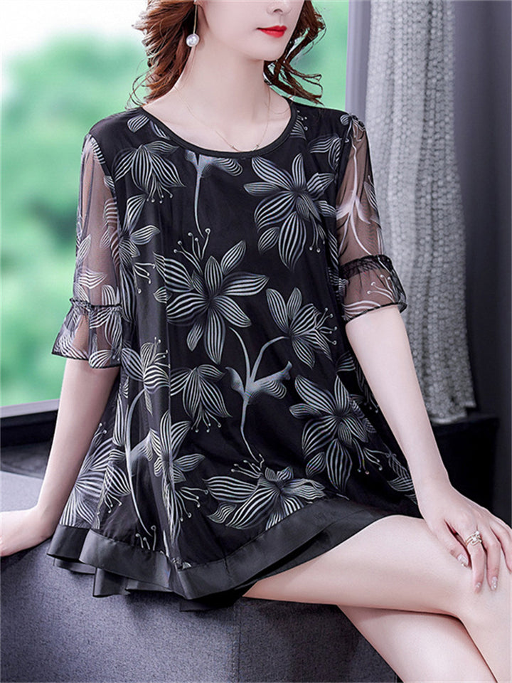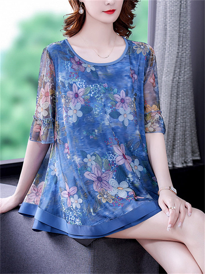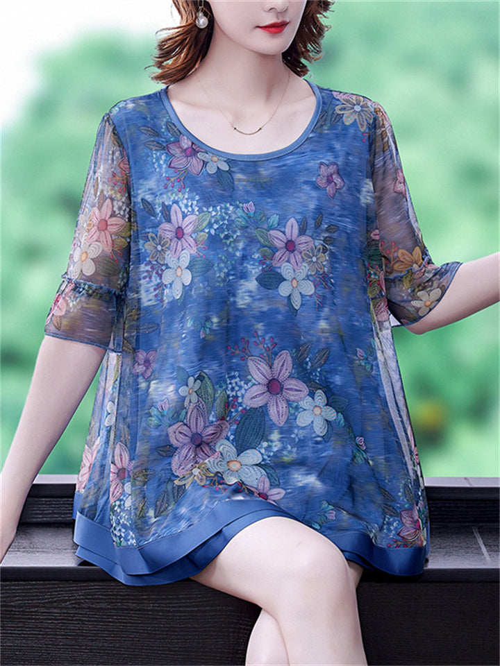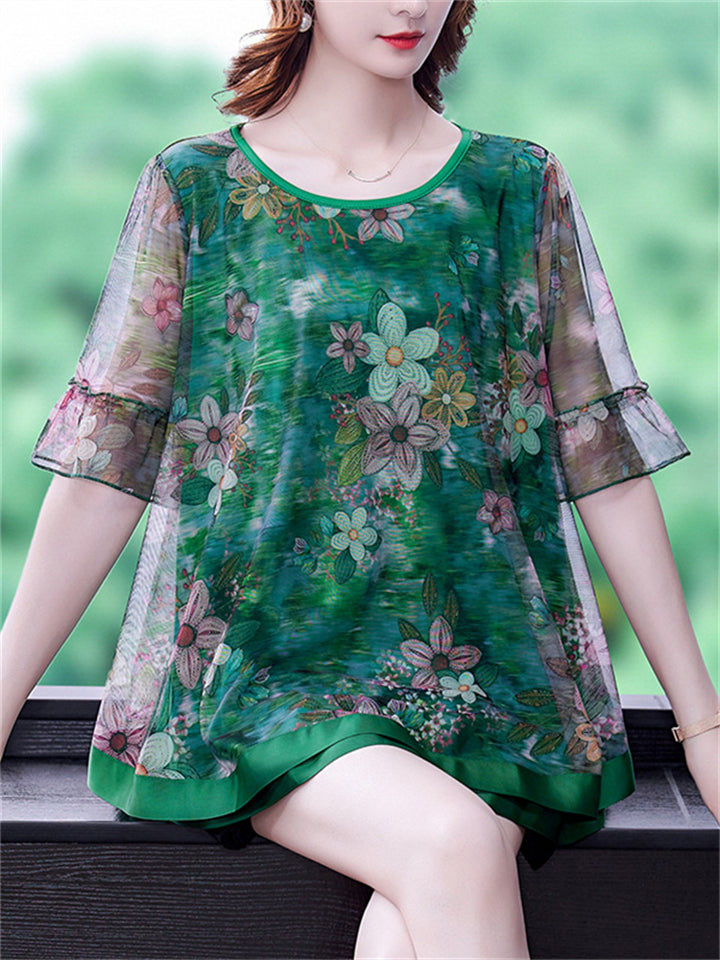 Elegant Round Neck Floral Print Smooth Chiffon Shirt for Lady