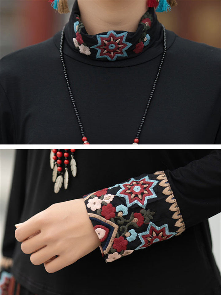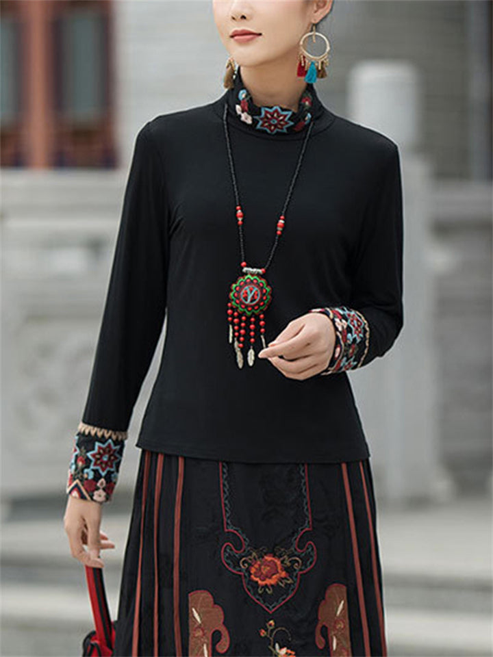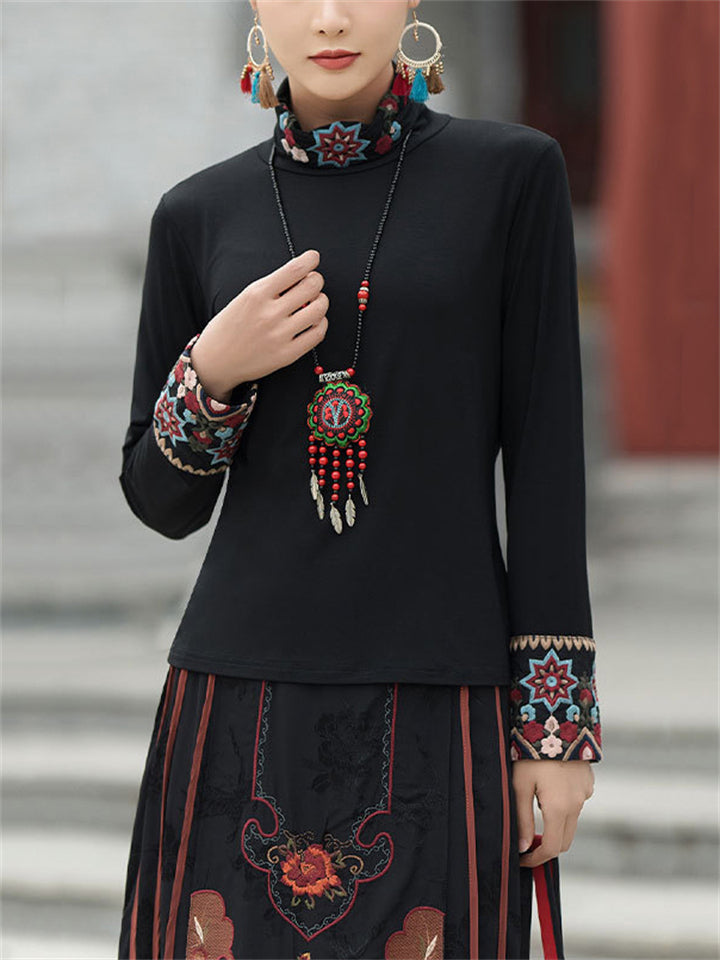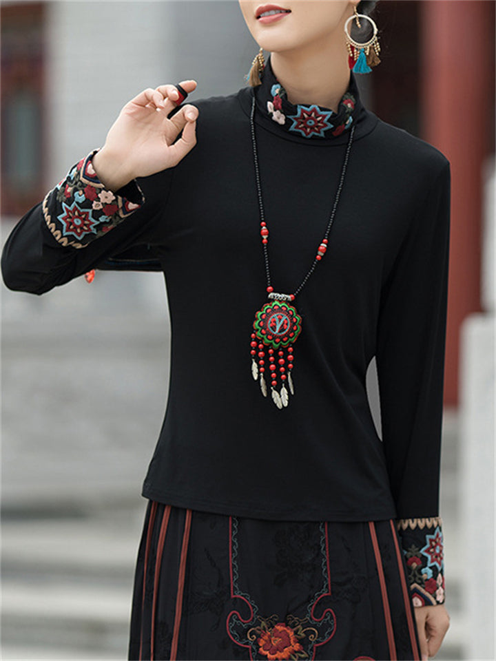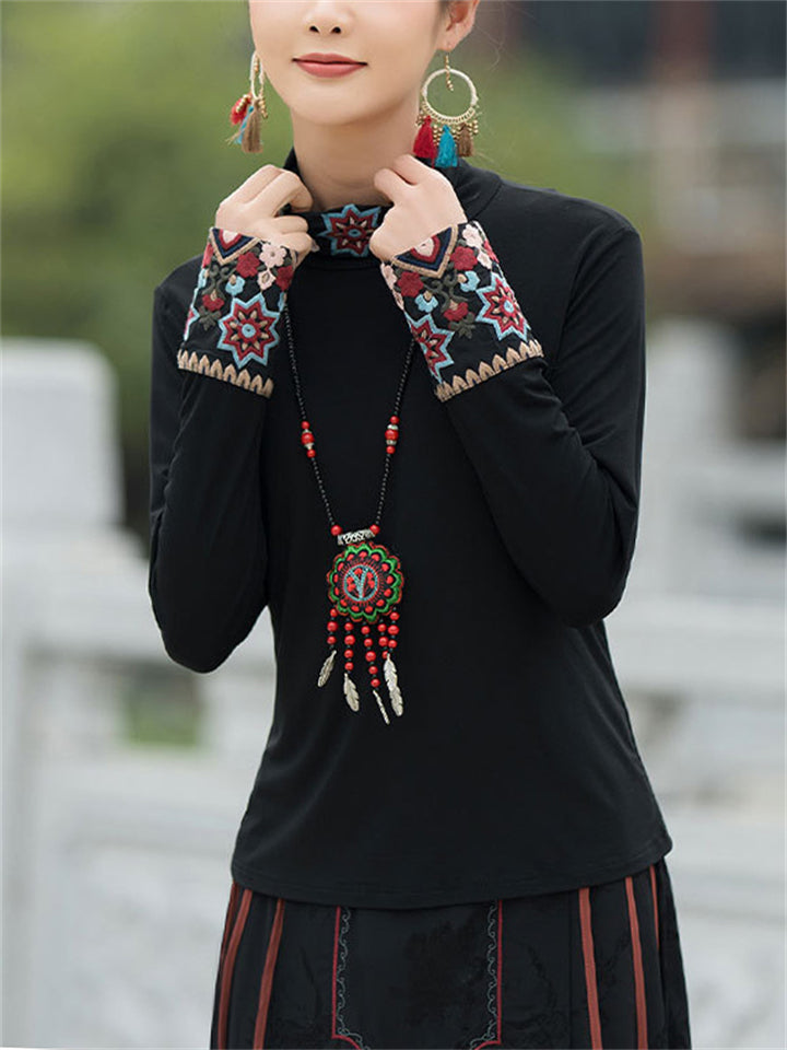 Ladies Ethnic Style Floral Embroidery Round Neck Shirts