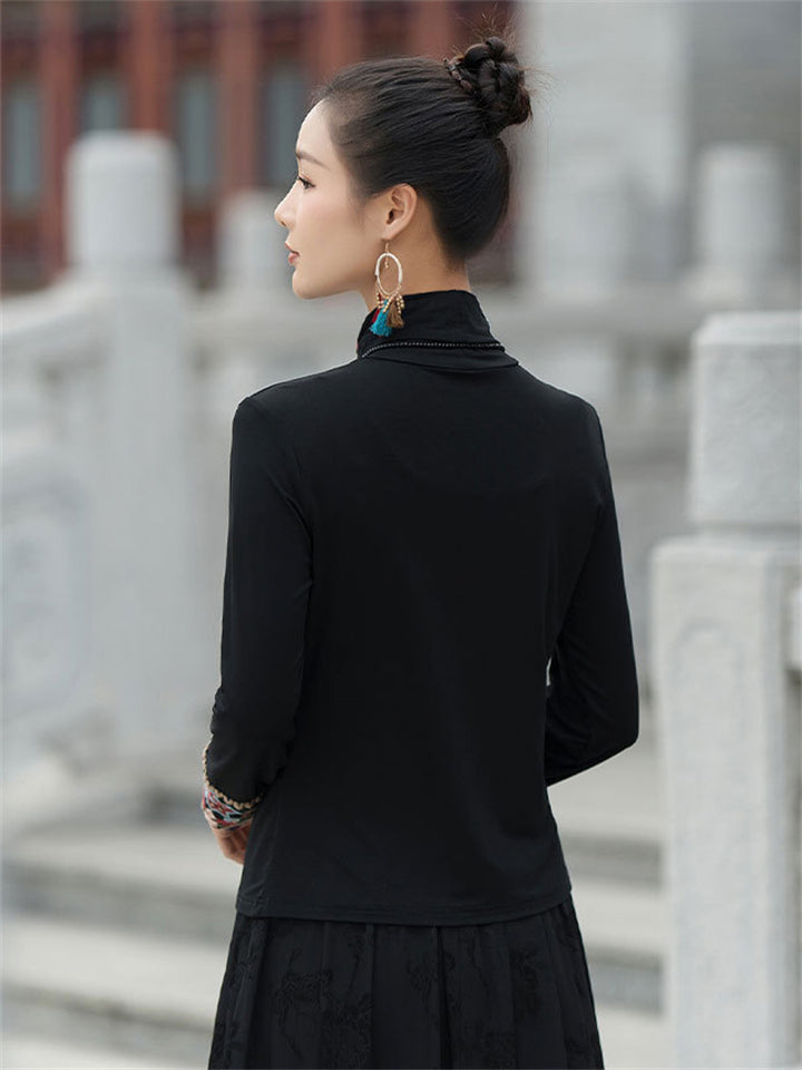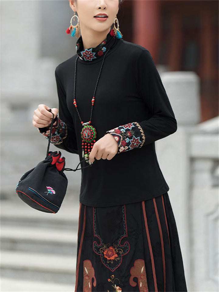 Ethnic High Neck Flower Embroidery Black Shirt for Women