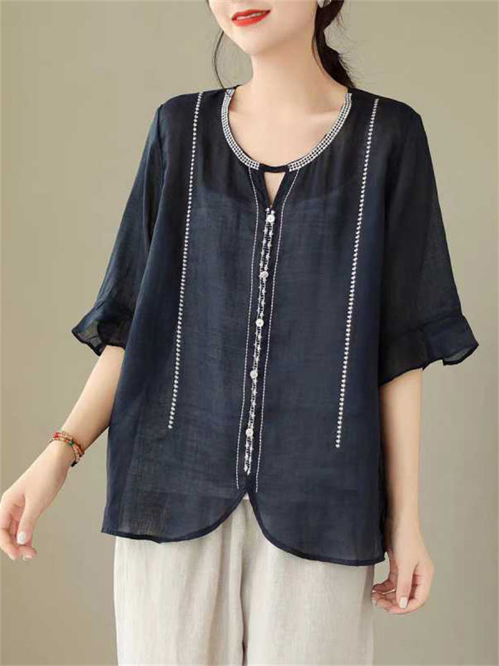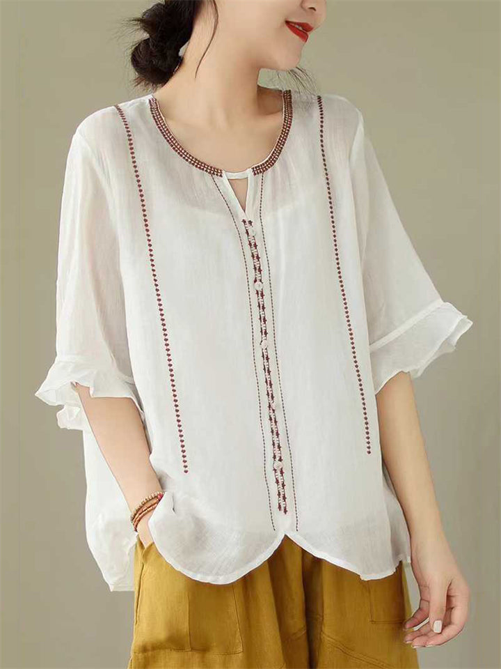 Ladies Ethnic Style Floral Embroidery Round Neck Shirts
