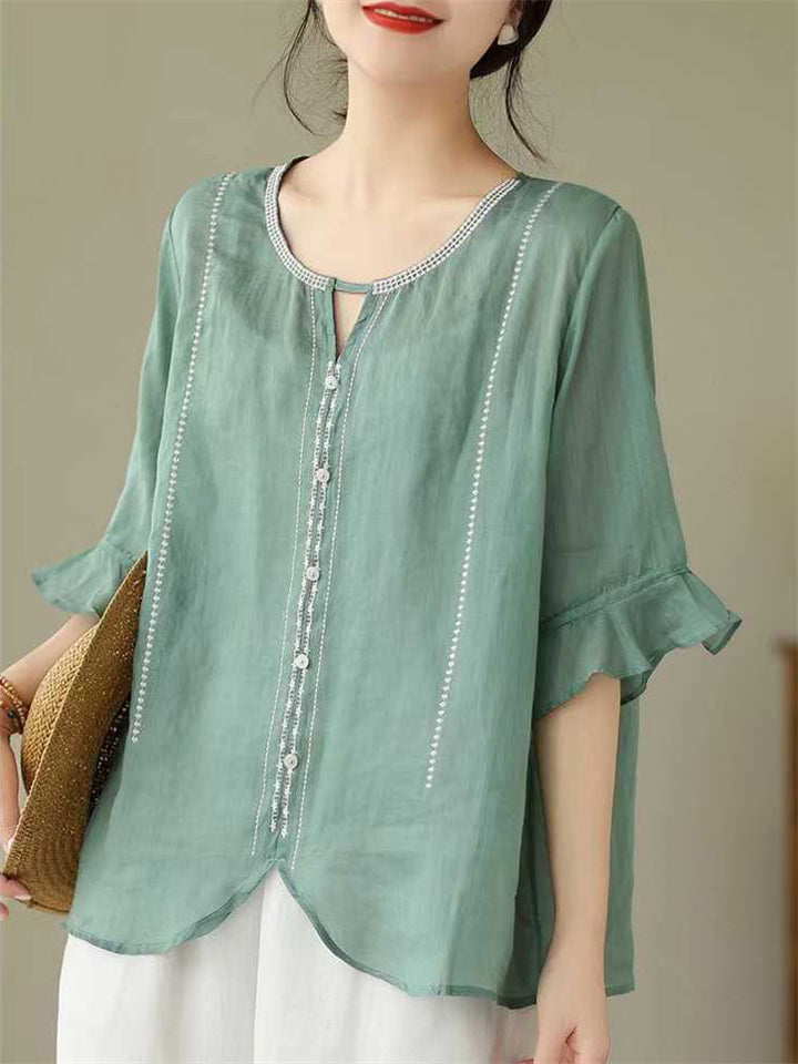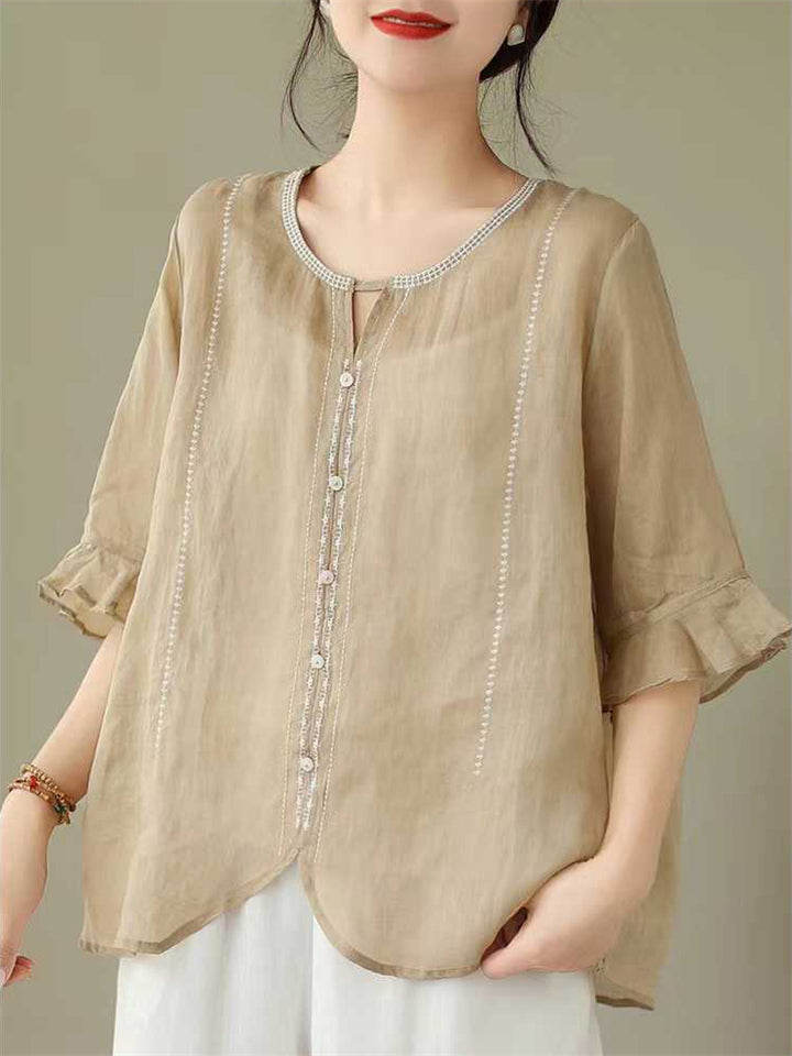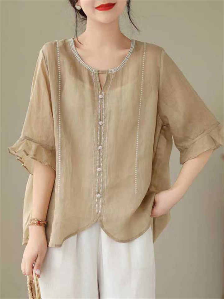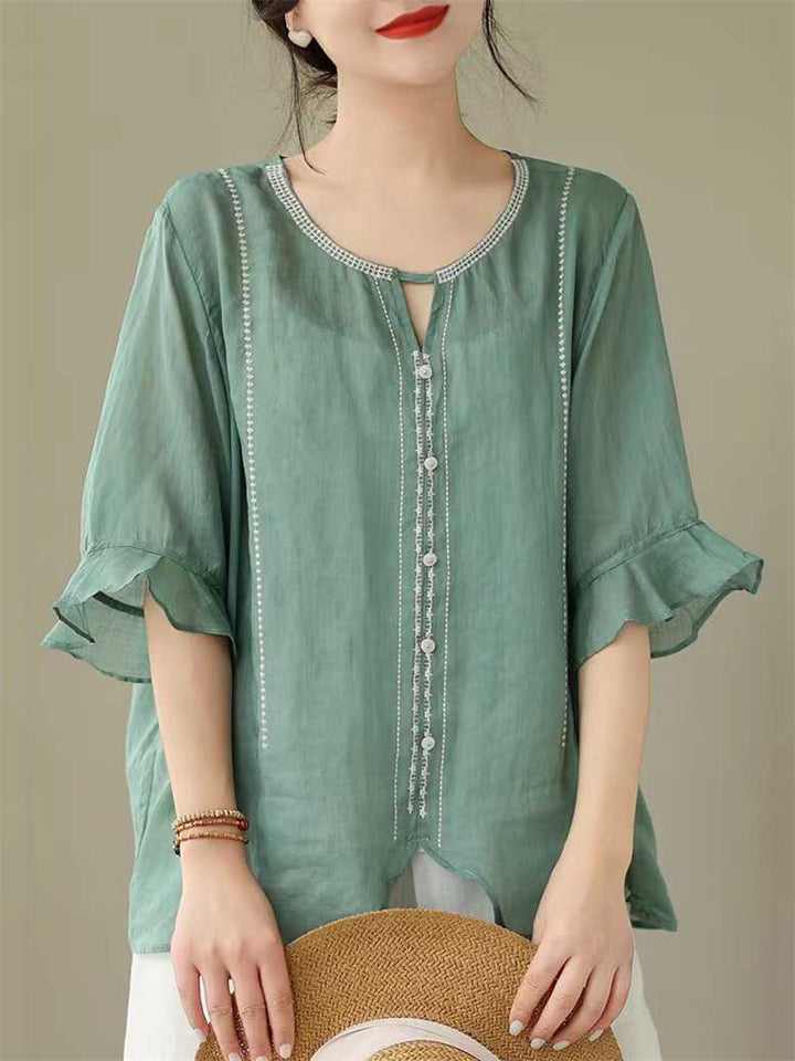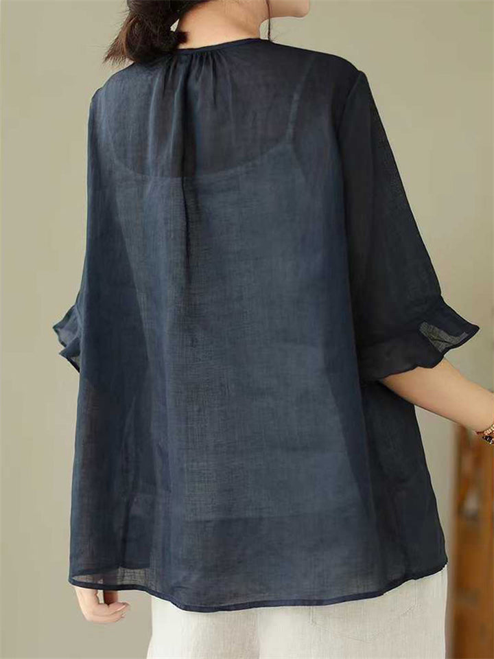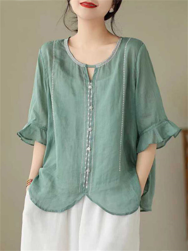 Ethnic Style Round Neck Ruffle Sleeve Transparent Shirt for Women