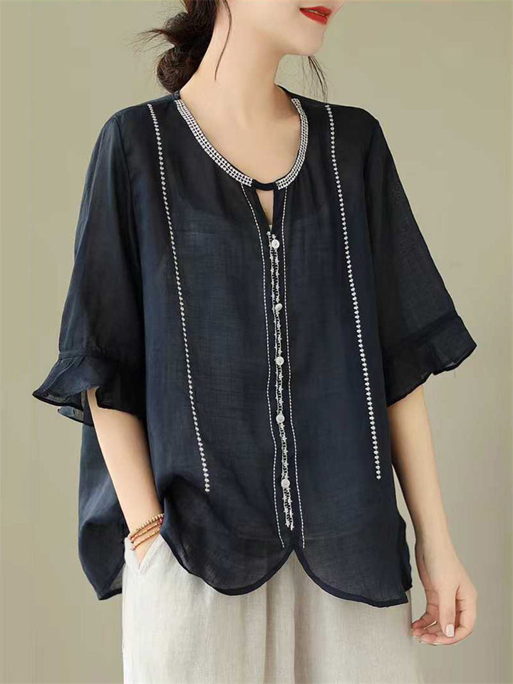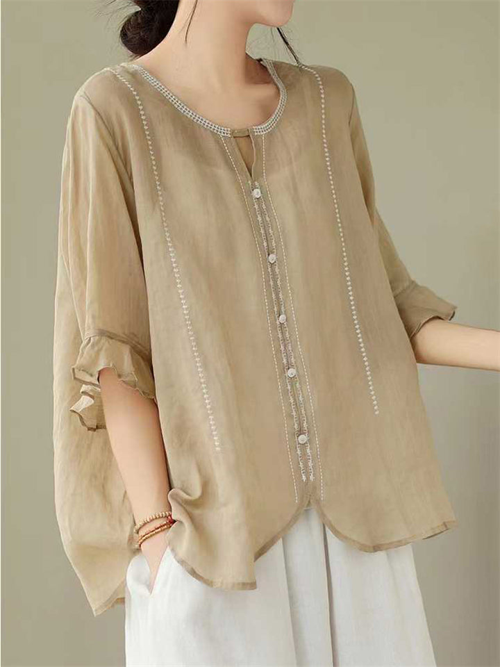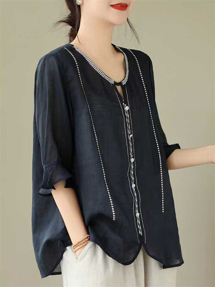 Ancient Chinese Style Floral Embroidery Linen Shirt for Women