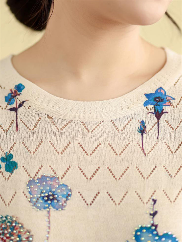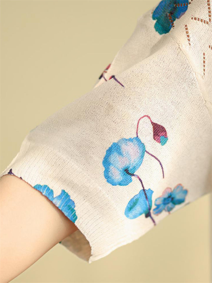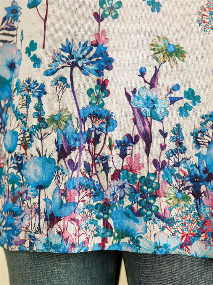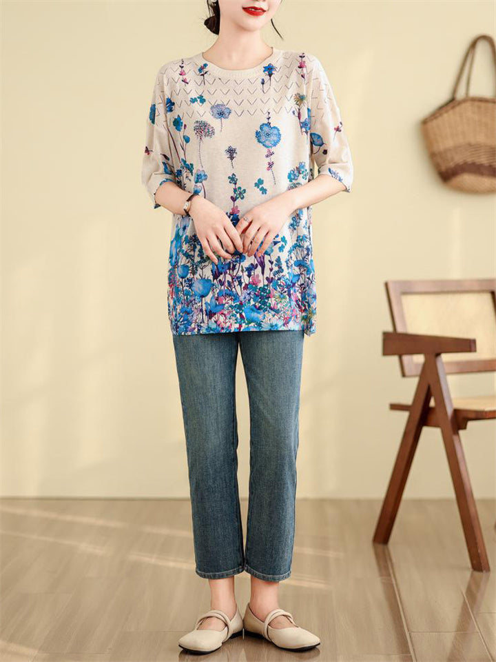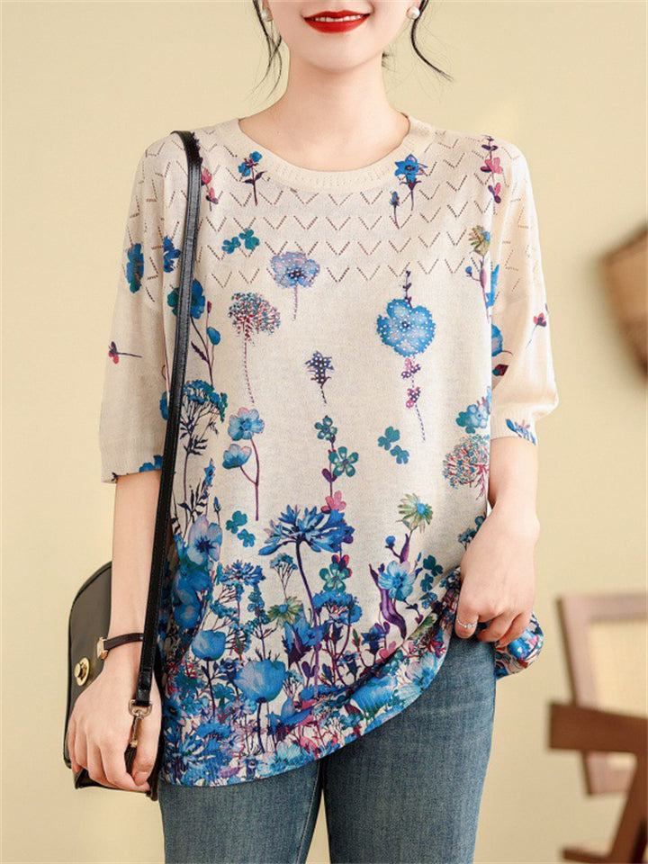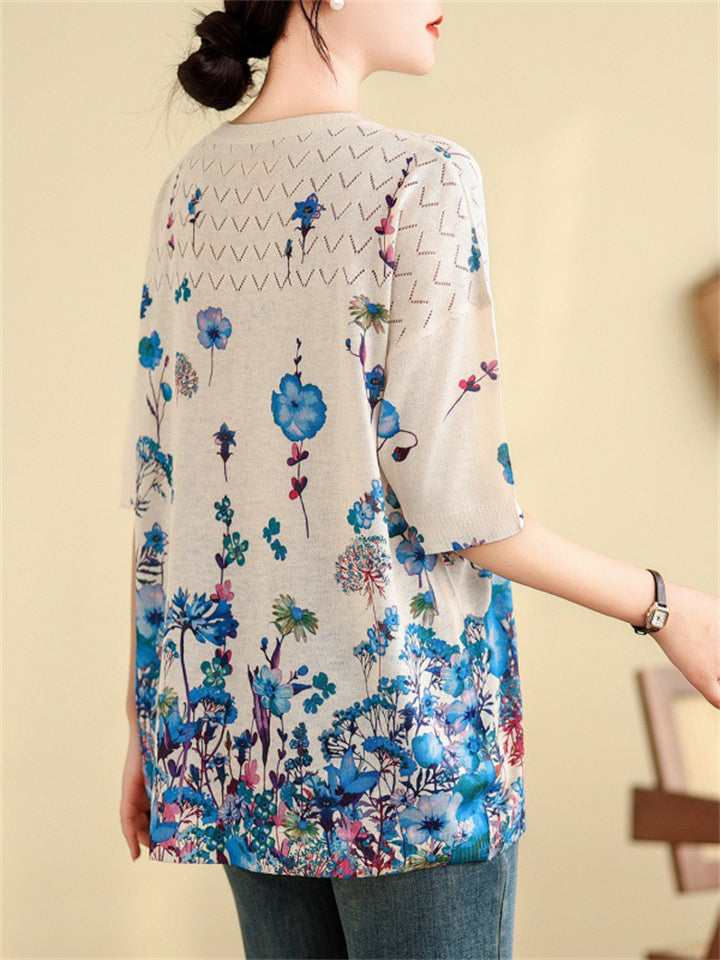 Female Blue Floral Print Crew Neck Short Sleeve Knit Shirt