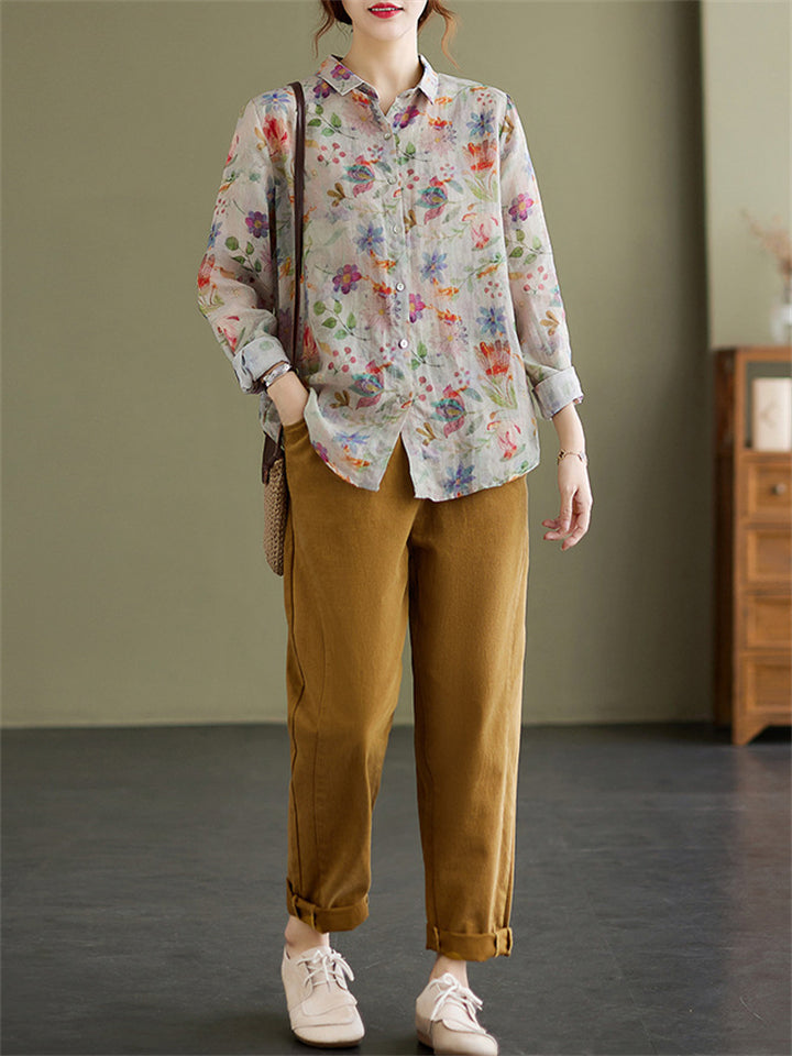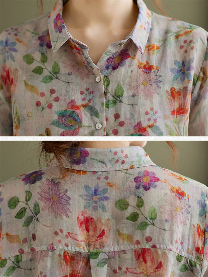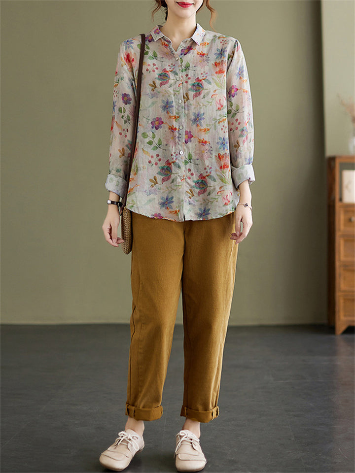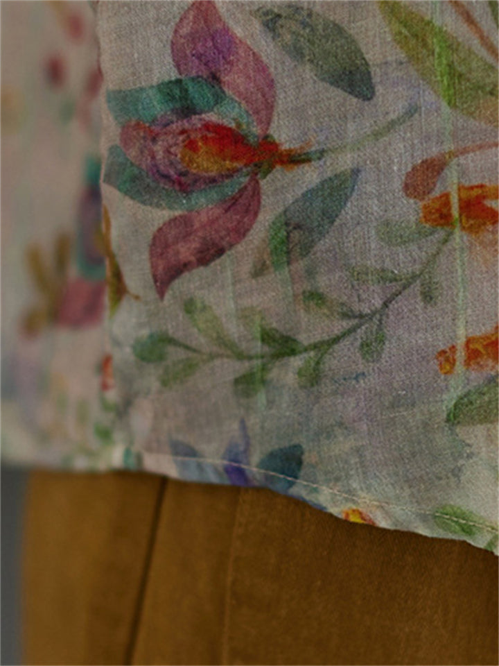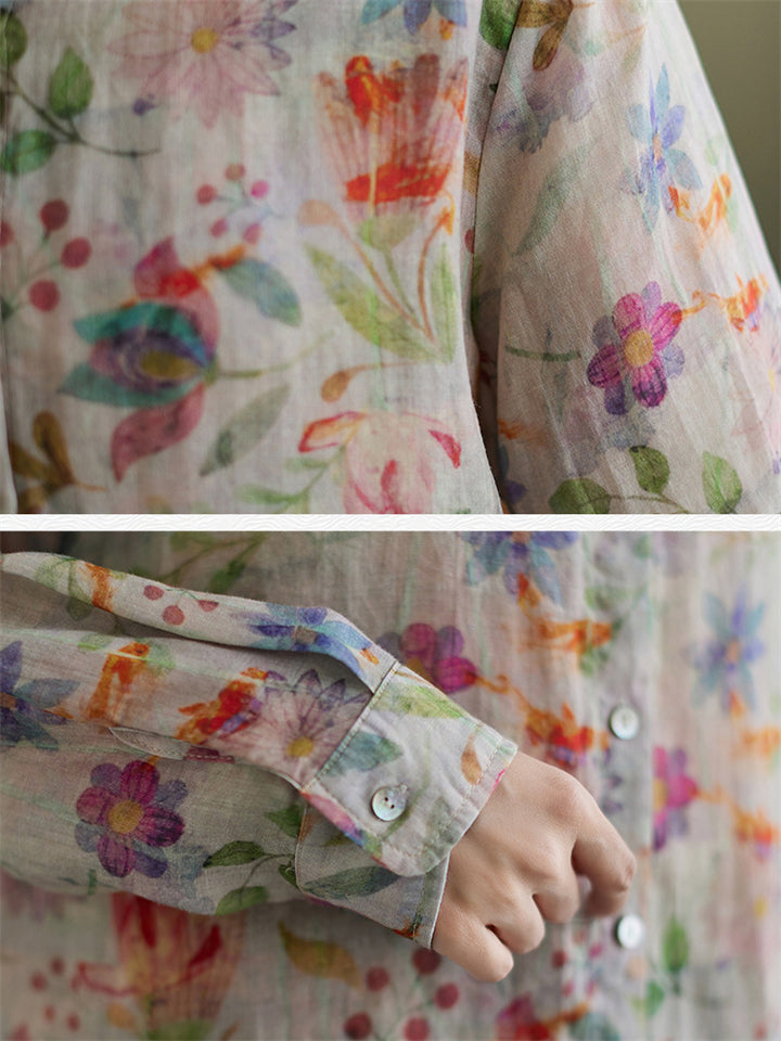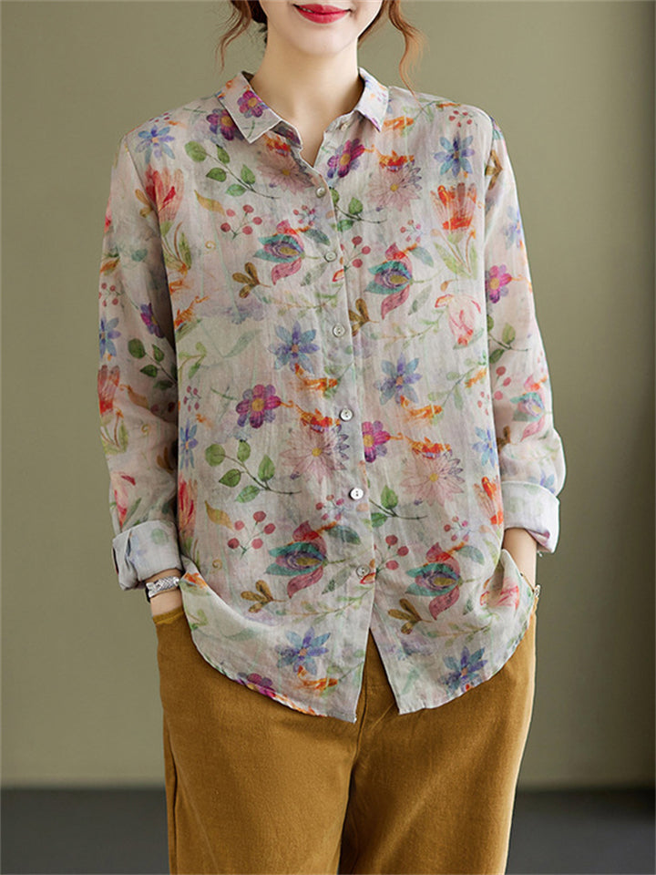 Female Cozy Literary Cotton Linen Floral Print Shirts