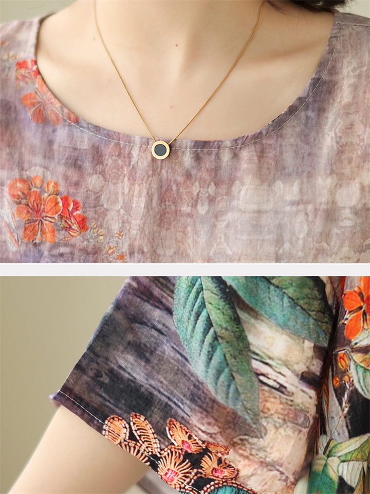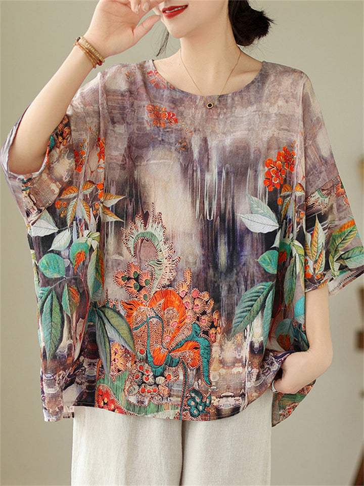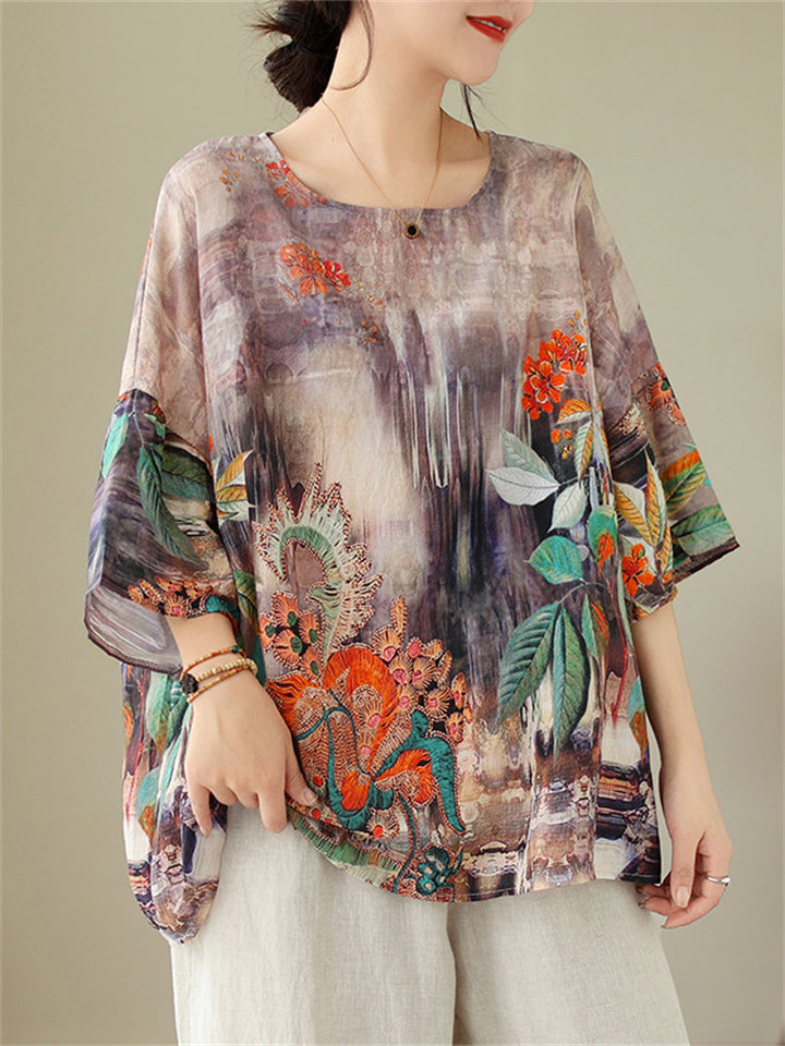 Ladies Ethnic Style Floral Embroidery Round Neck Shirts