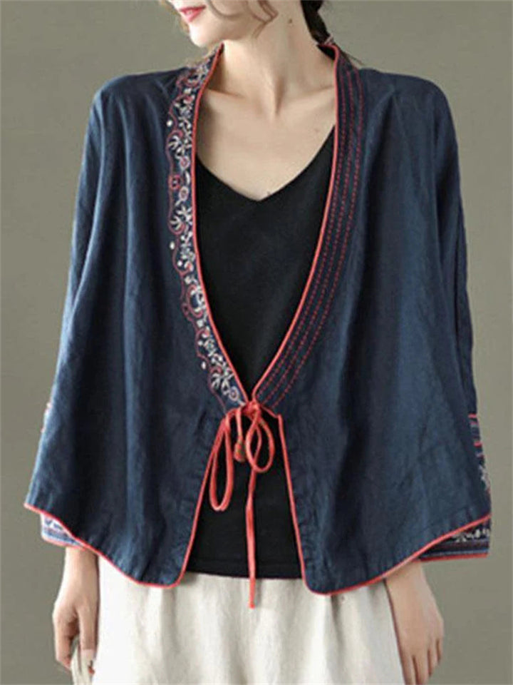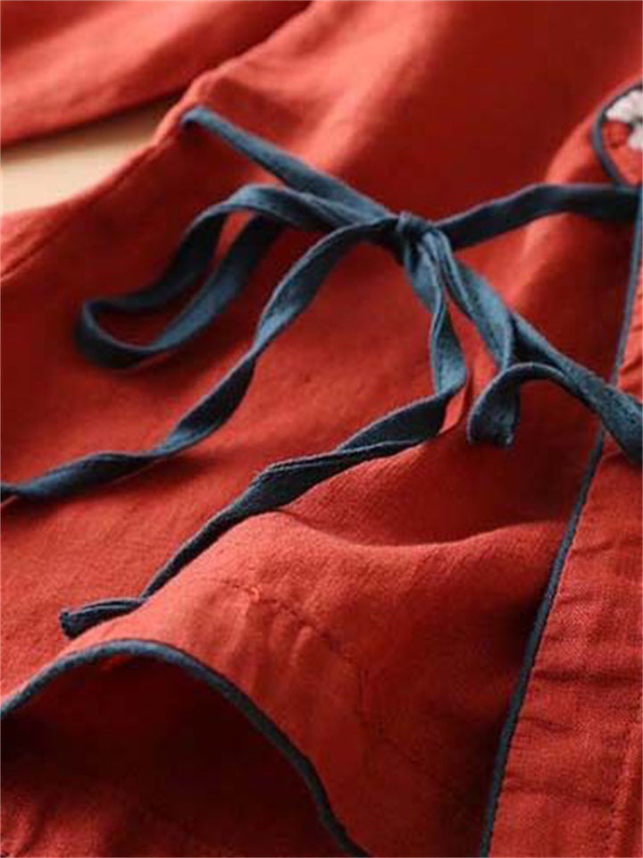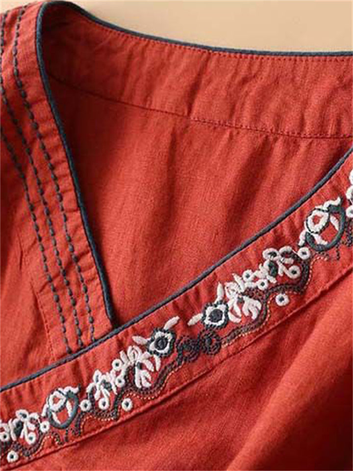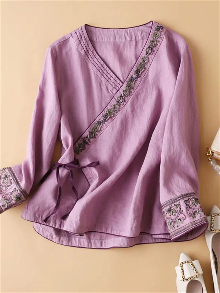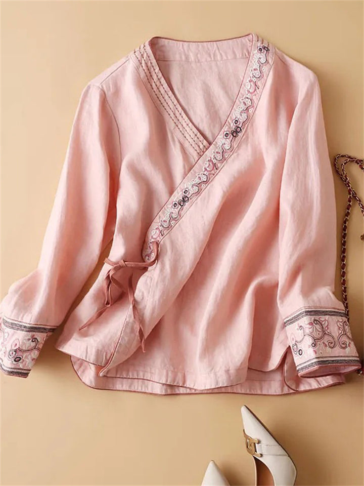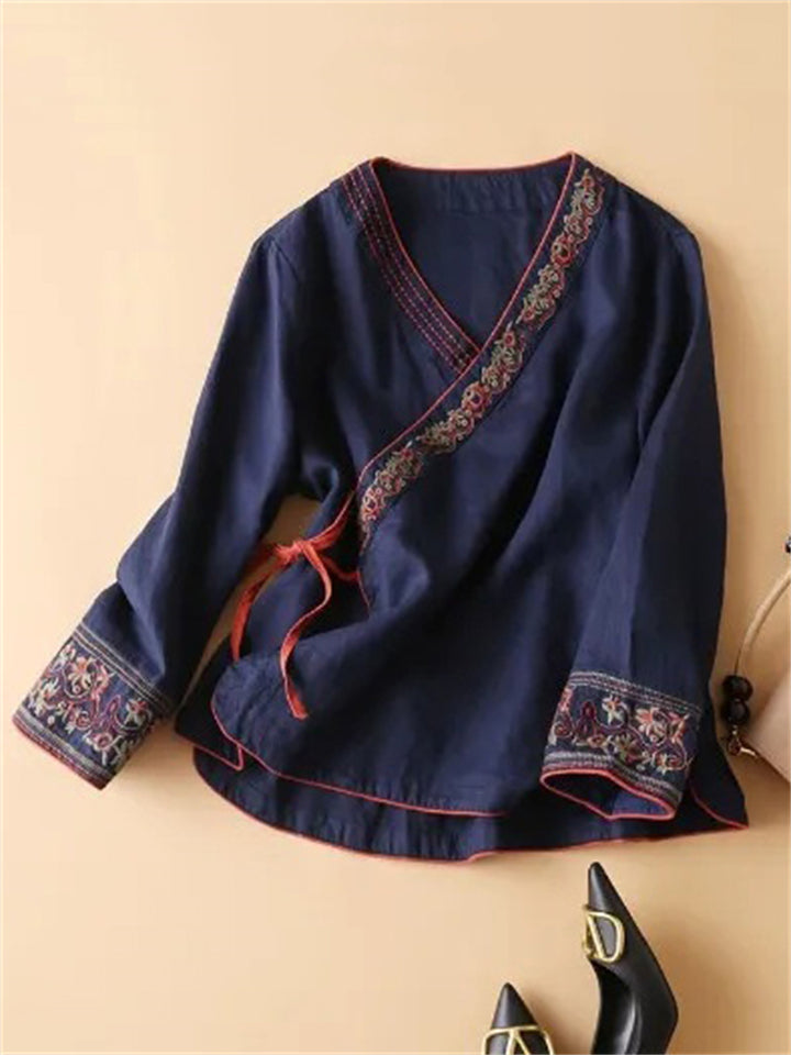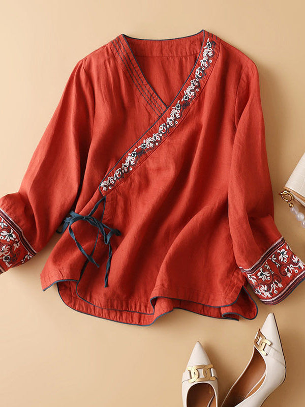 Female Ethnic Style V Neck Embroideried Side Lace Up Cotton Shirt