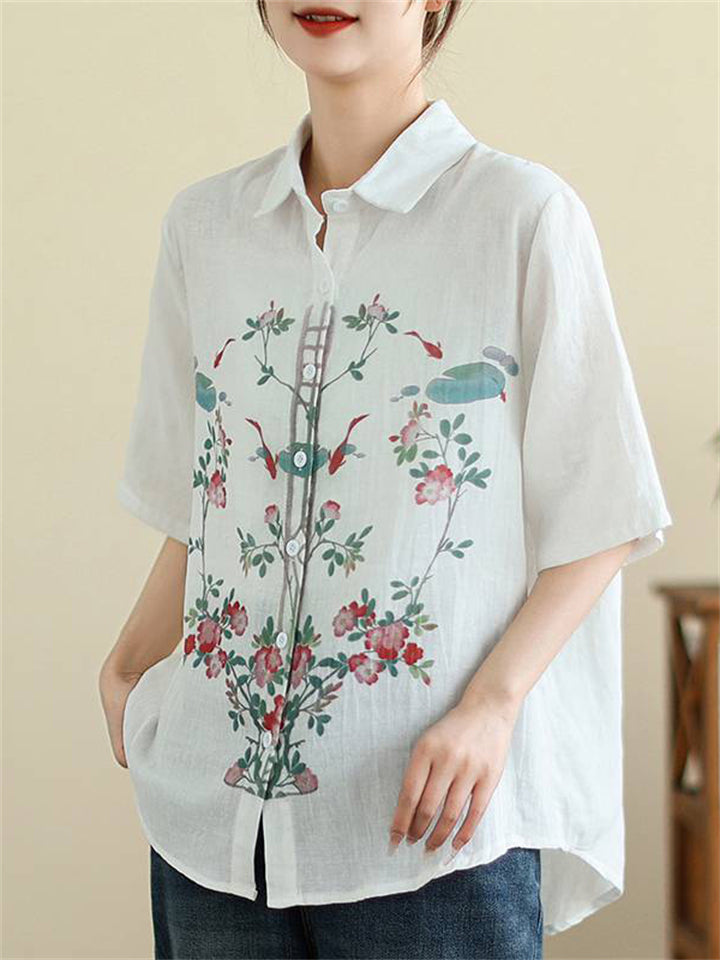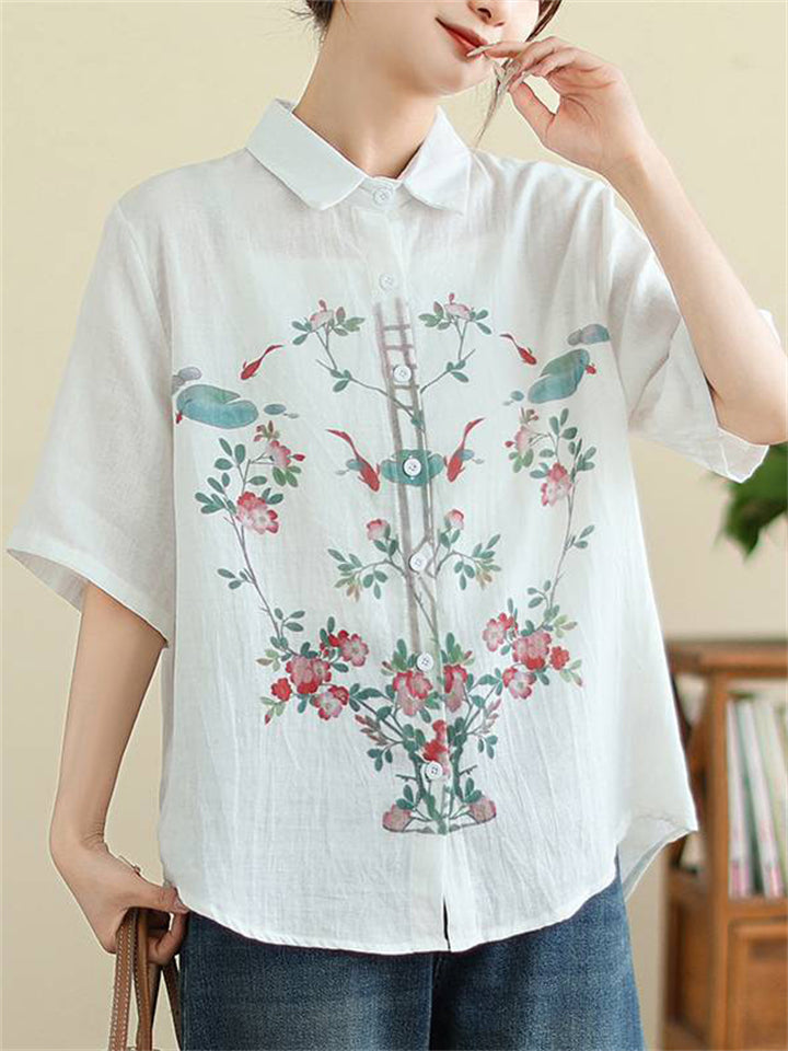 Female Koi Lotus Leaf Floral Print Button-Up Shirts