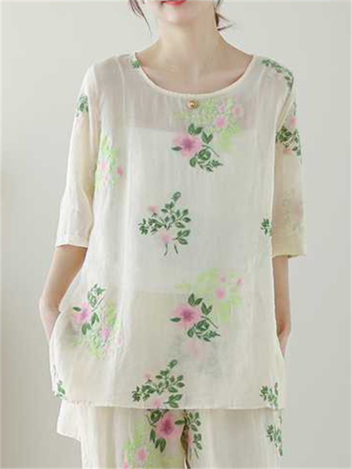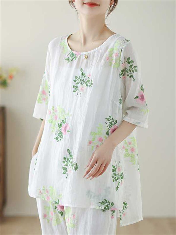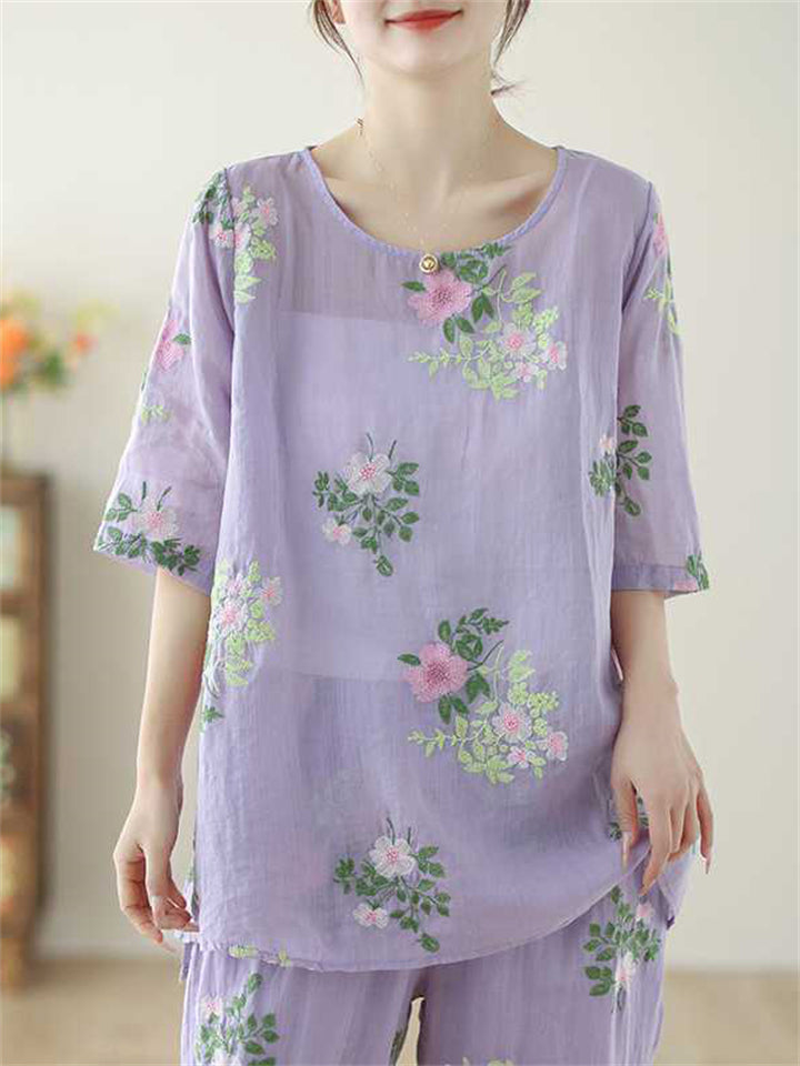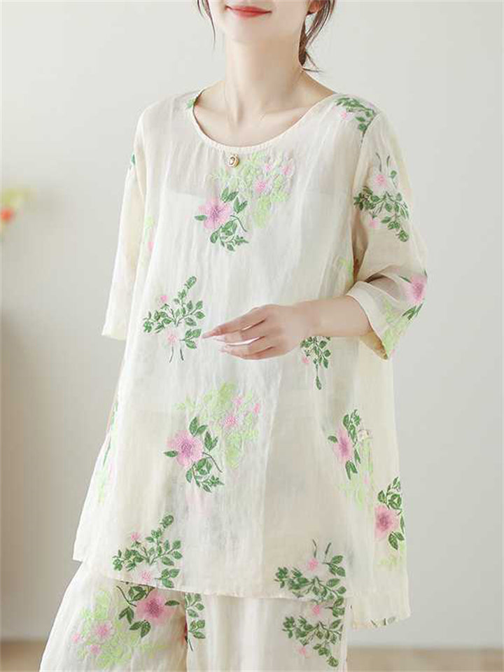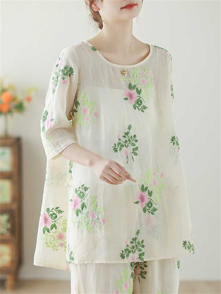 Ladies Ethnic Style Floral Embroidery Round Neck Shirts