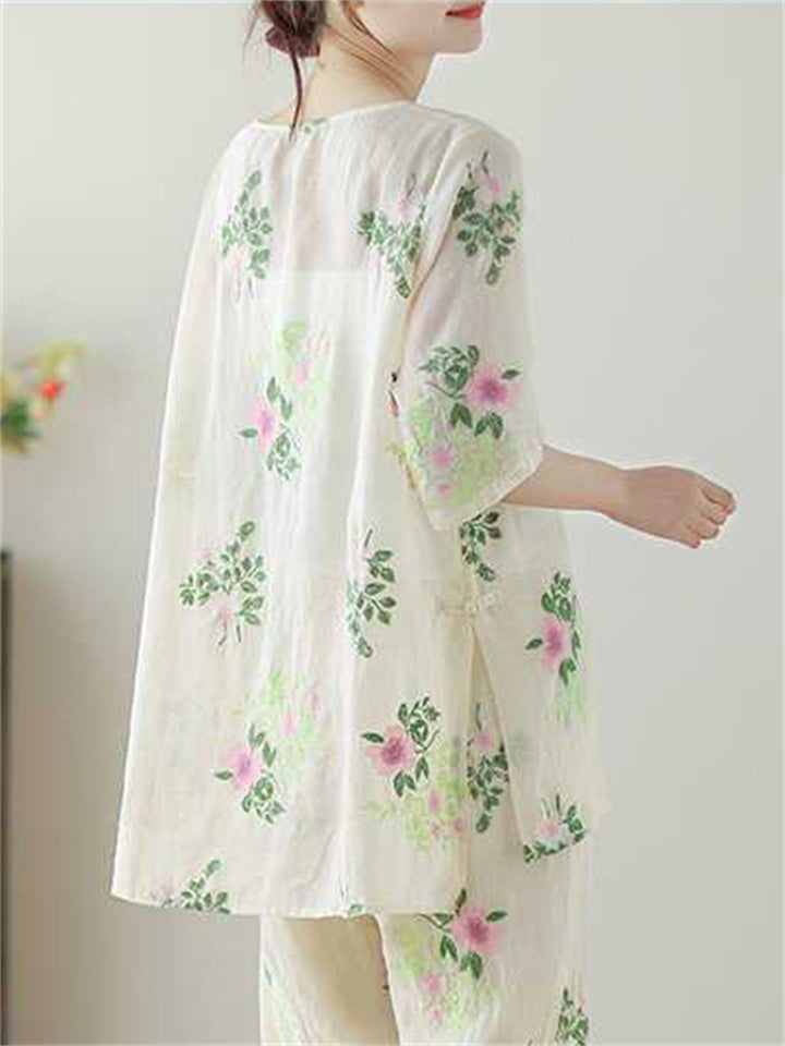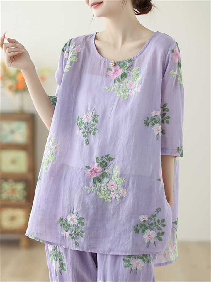 Female Lightweight Floral Leaf Embroidered Homewear Shirts
