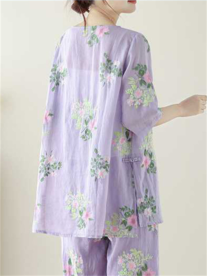 Ancient Chinese Style Floral Embroidery Linen Shirt for Women