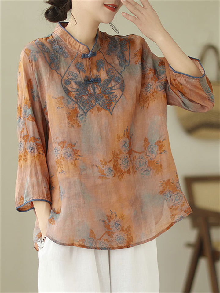 Lady Stand-up Collar Floral Printed Chinese Style Shirts