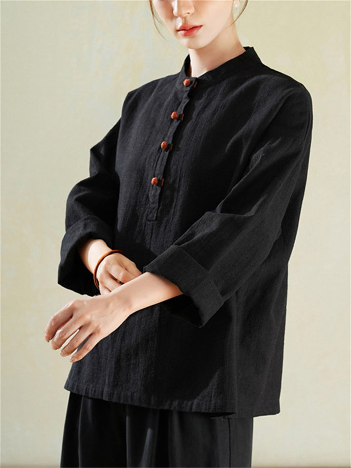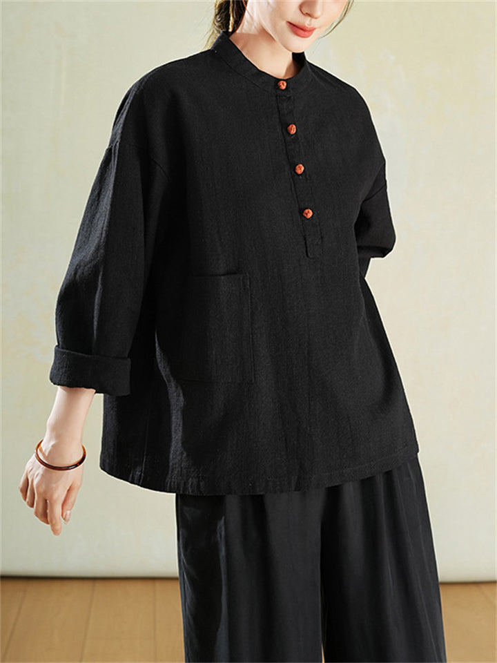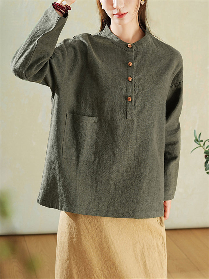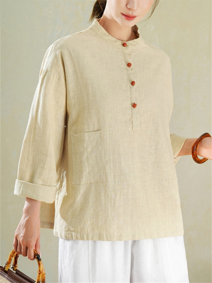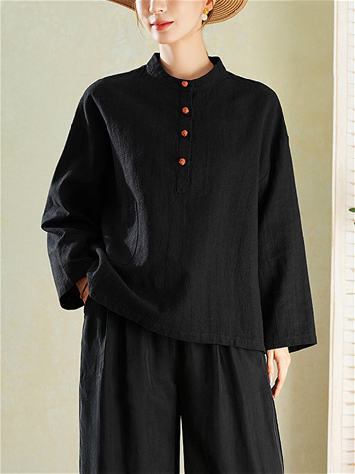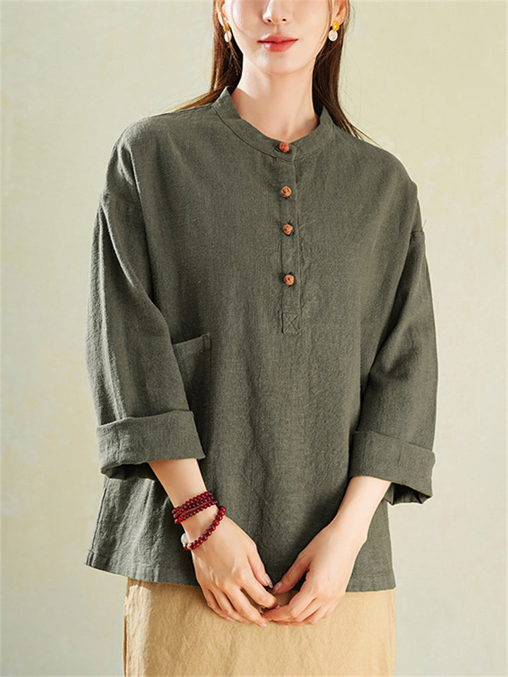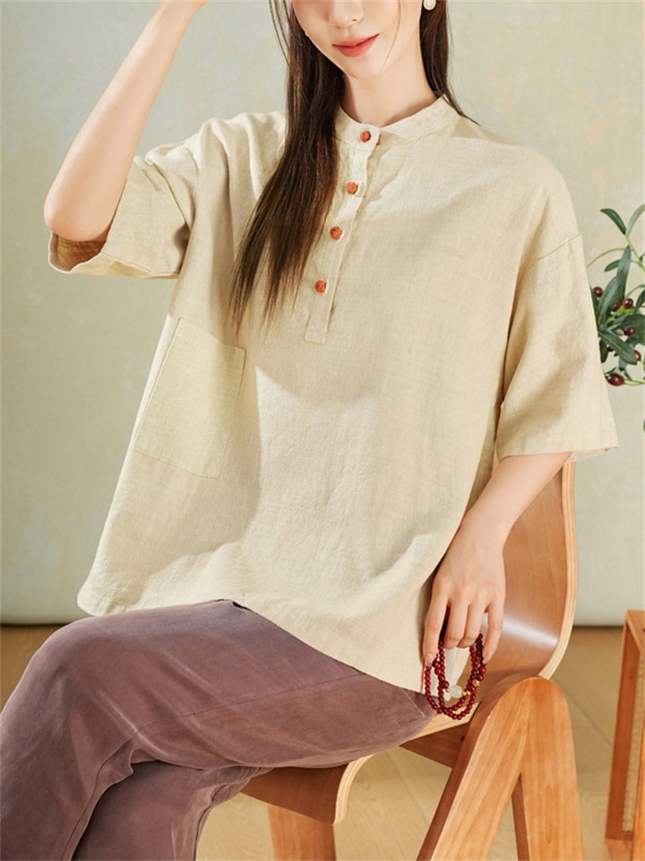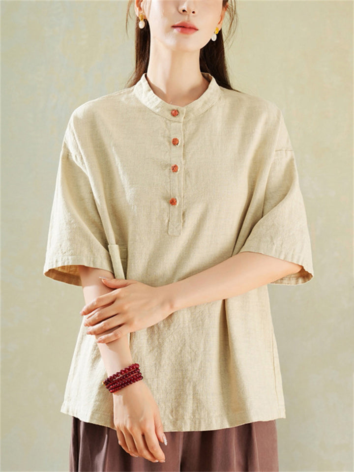 Female Simple Stand Collar Short Sleeve & Long Sleeve Linen Shirts