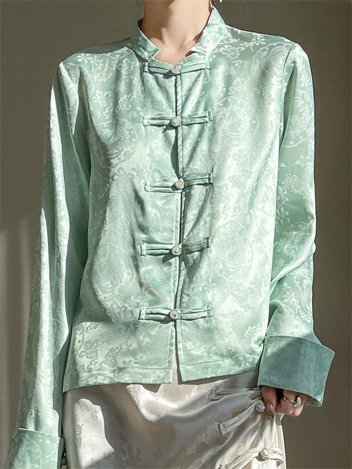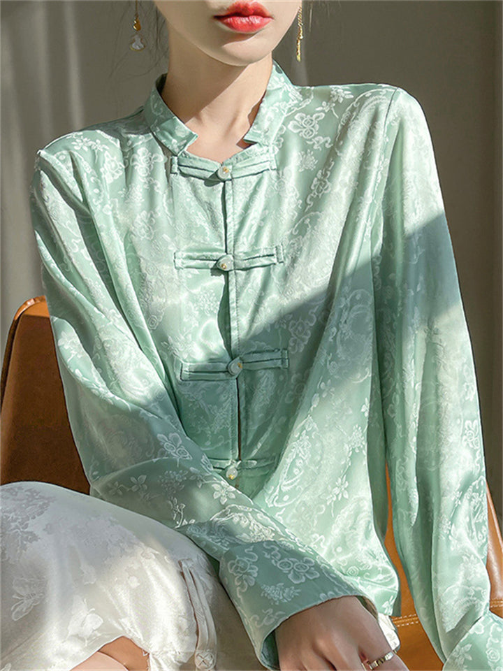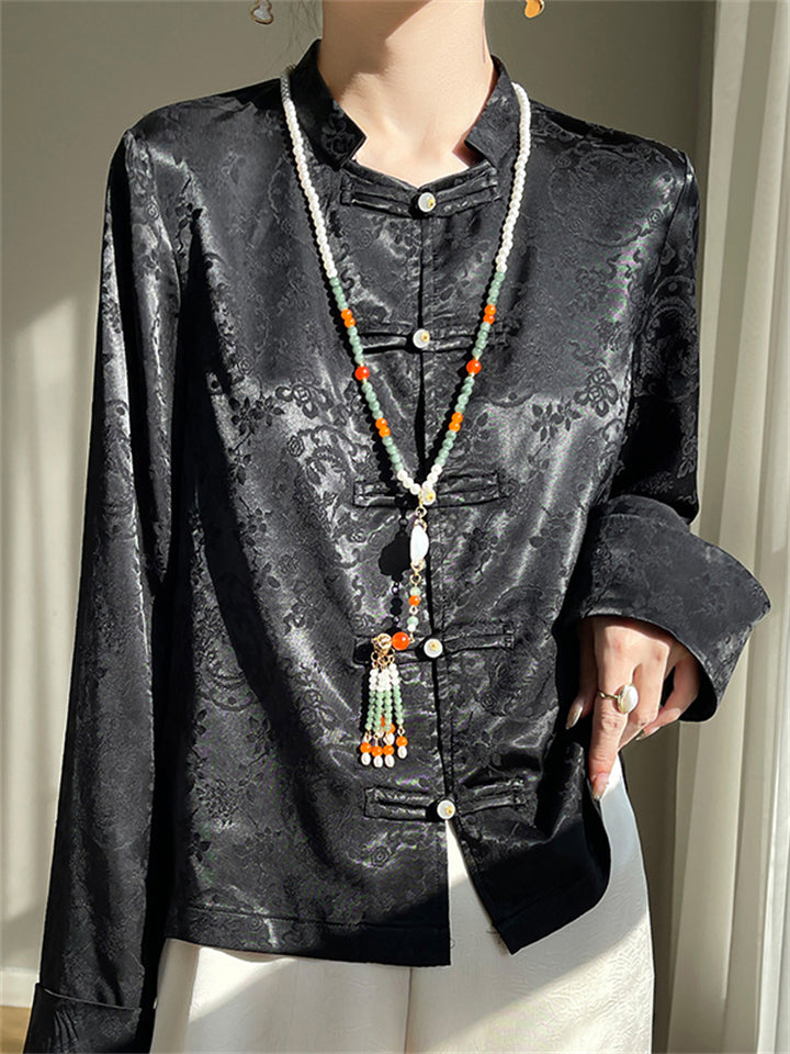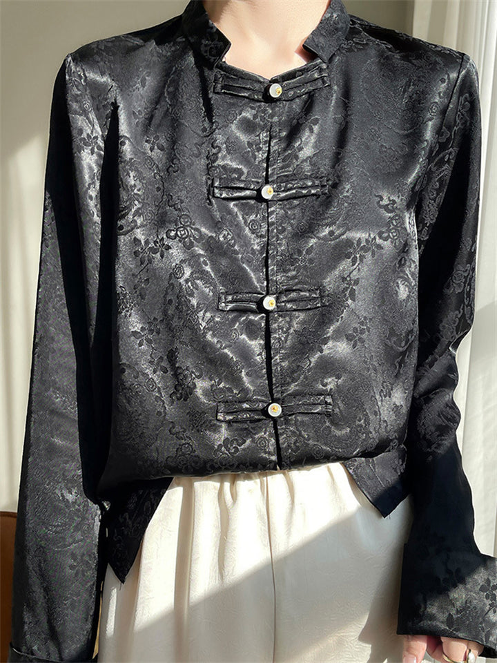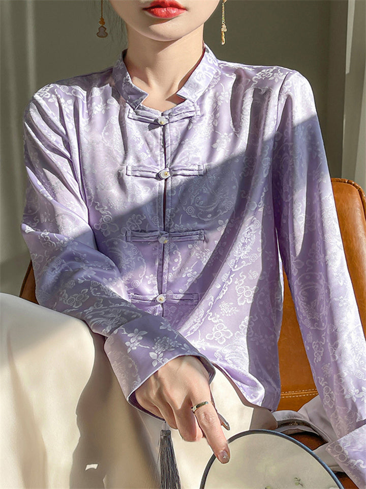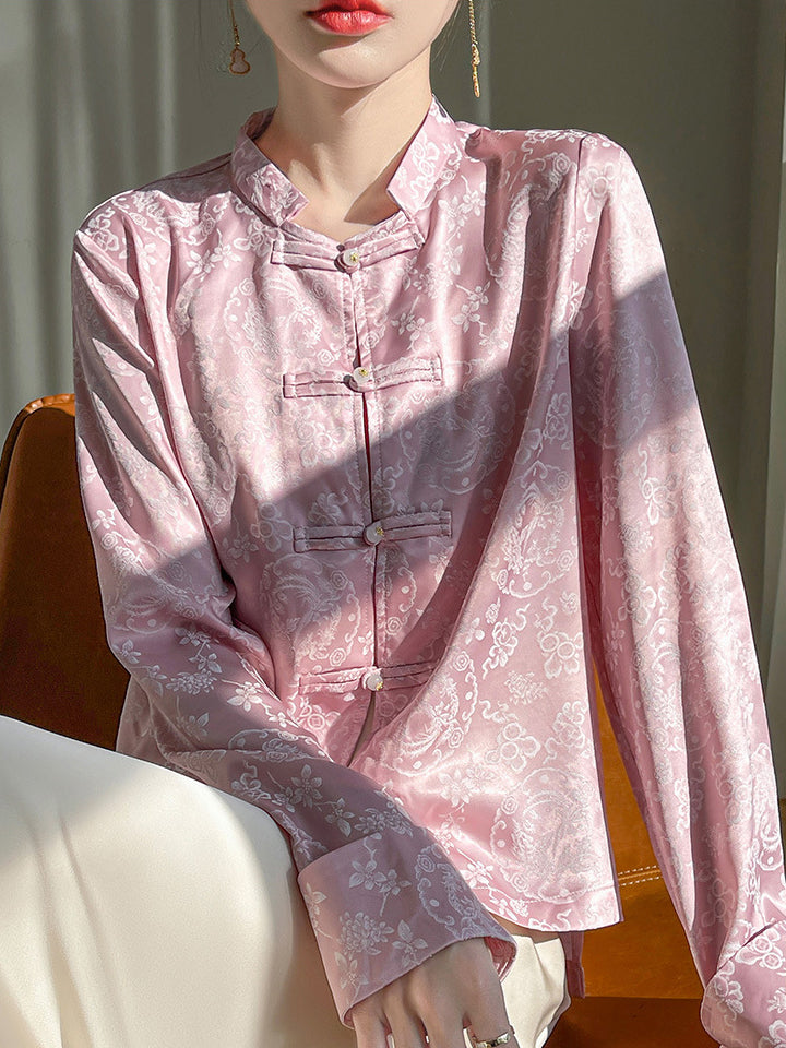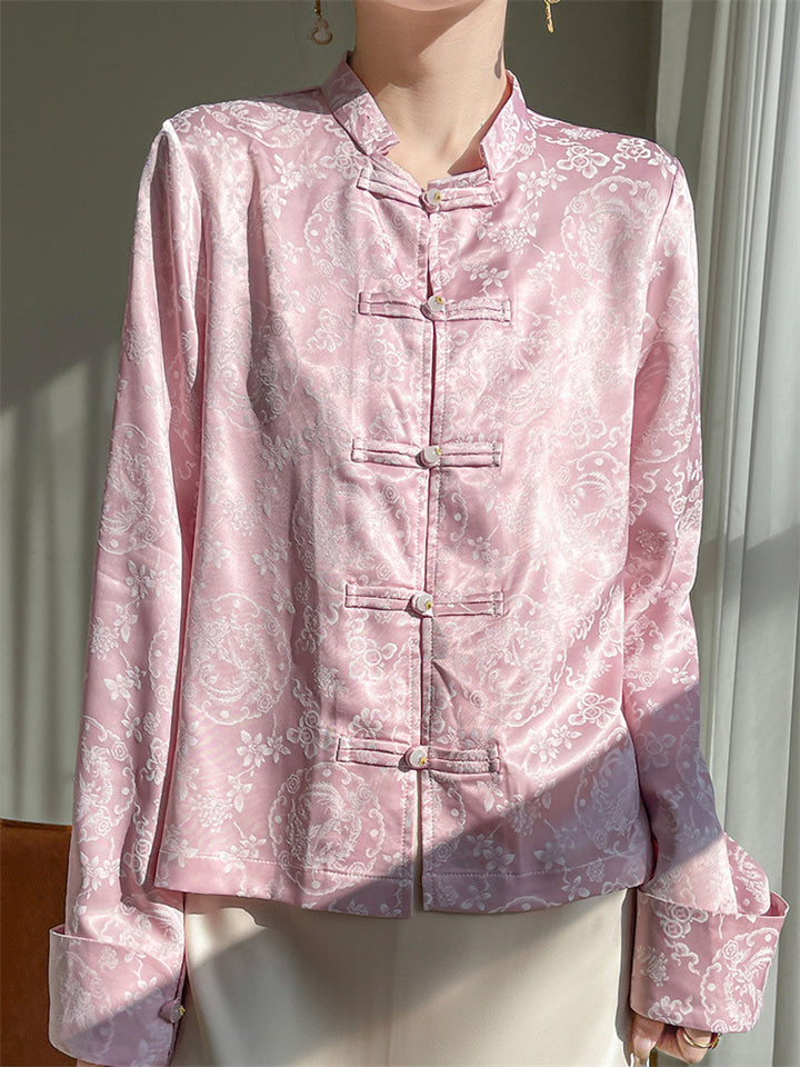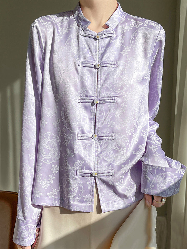 Lady Stand-up Collar Floral Printed Chinese Style Shirts
