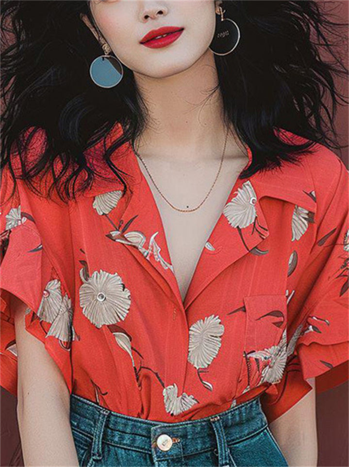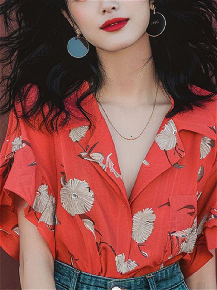 Female Summer Red Floral Print V-Neck Ruffled Sleeve Shirt