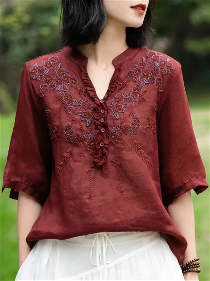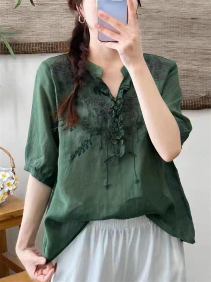 Female Summer V Neck Embroidered Breathable Shirts