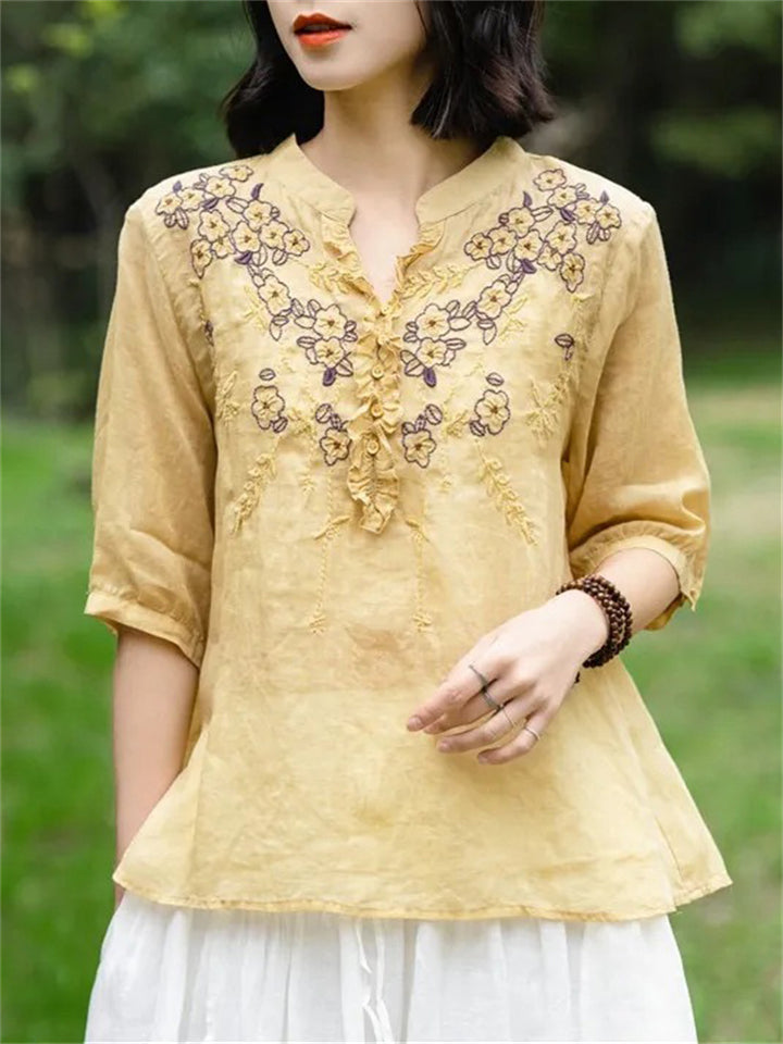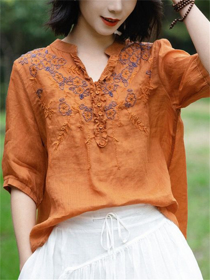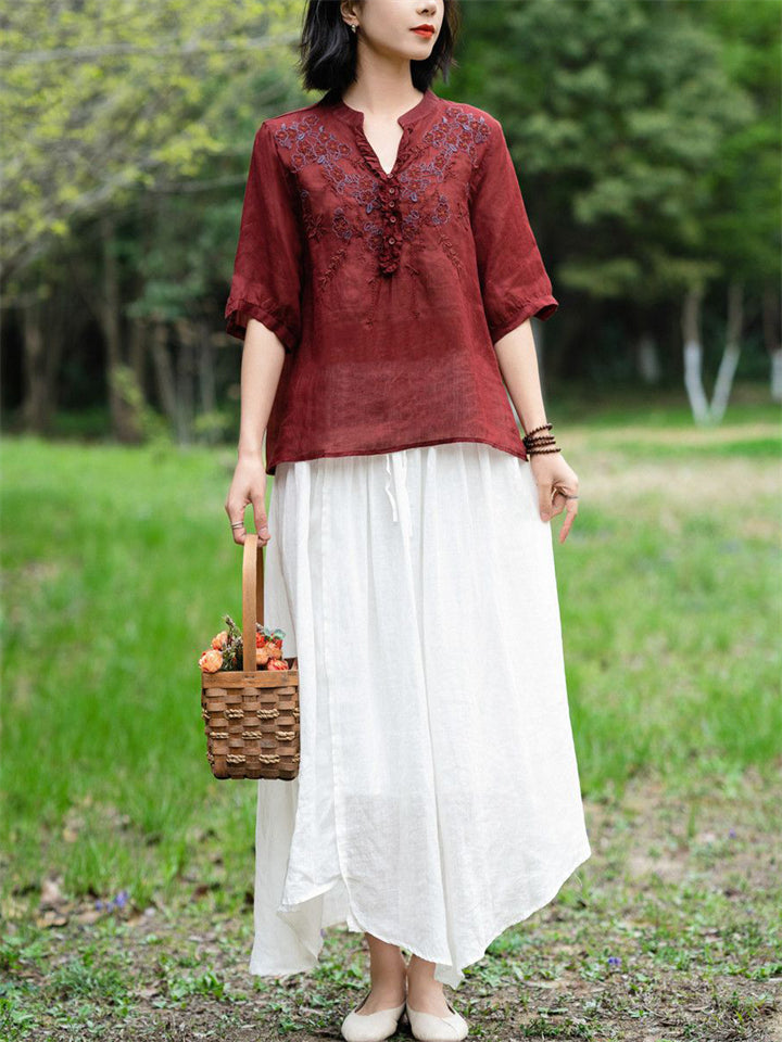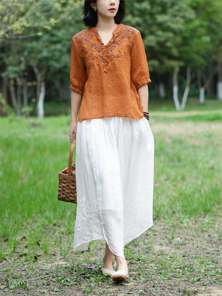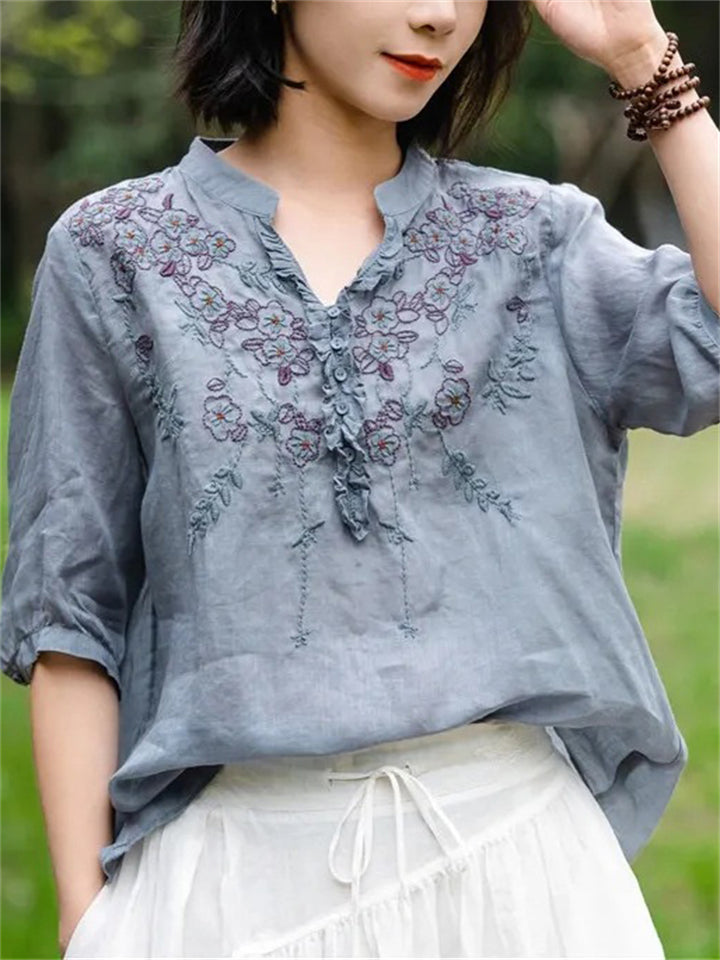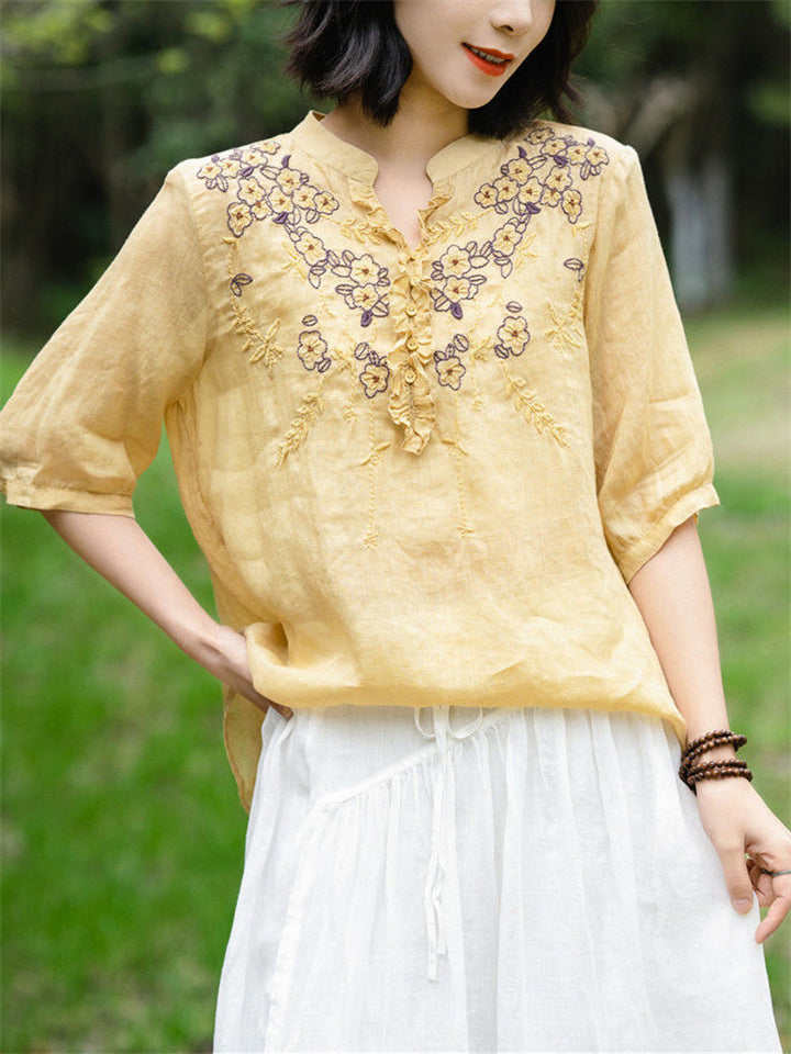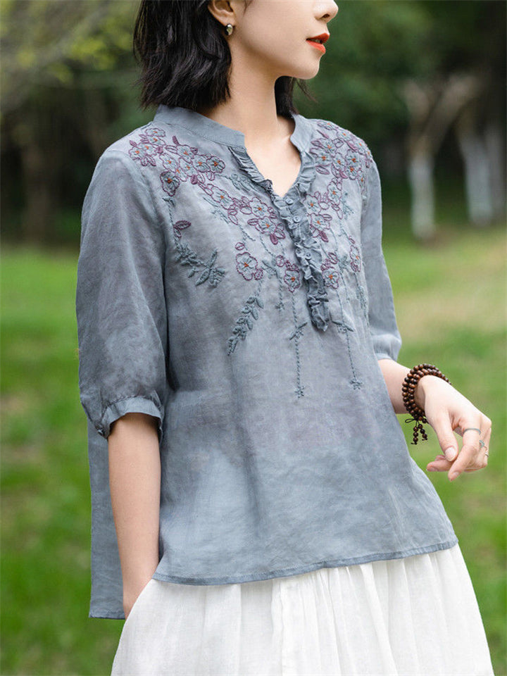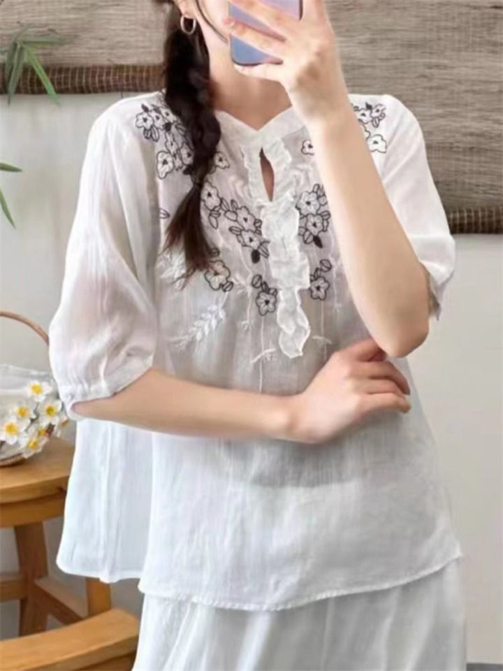 Ancient Chinese Style Floral Embroidery Linen Shirt for Women