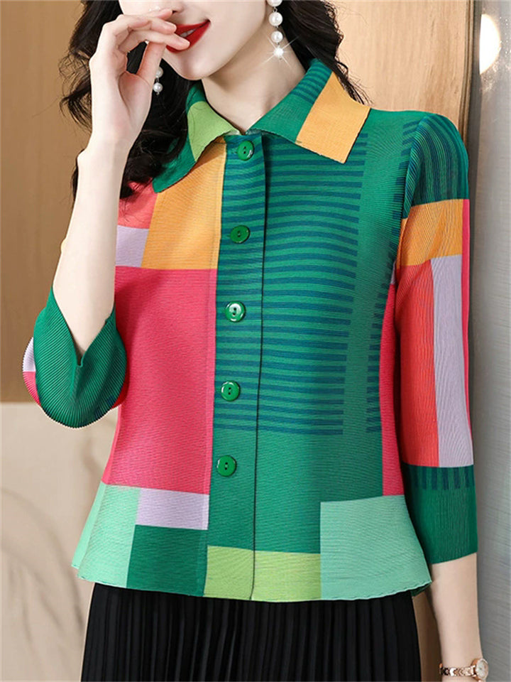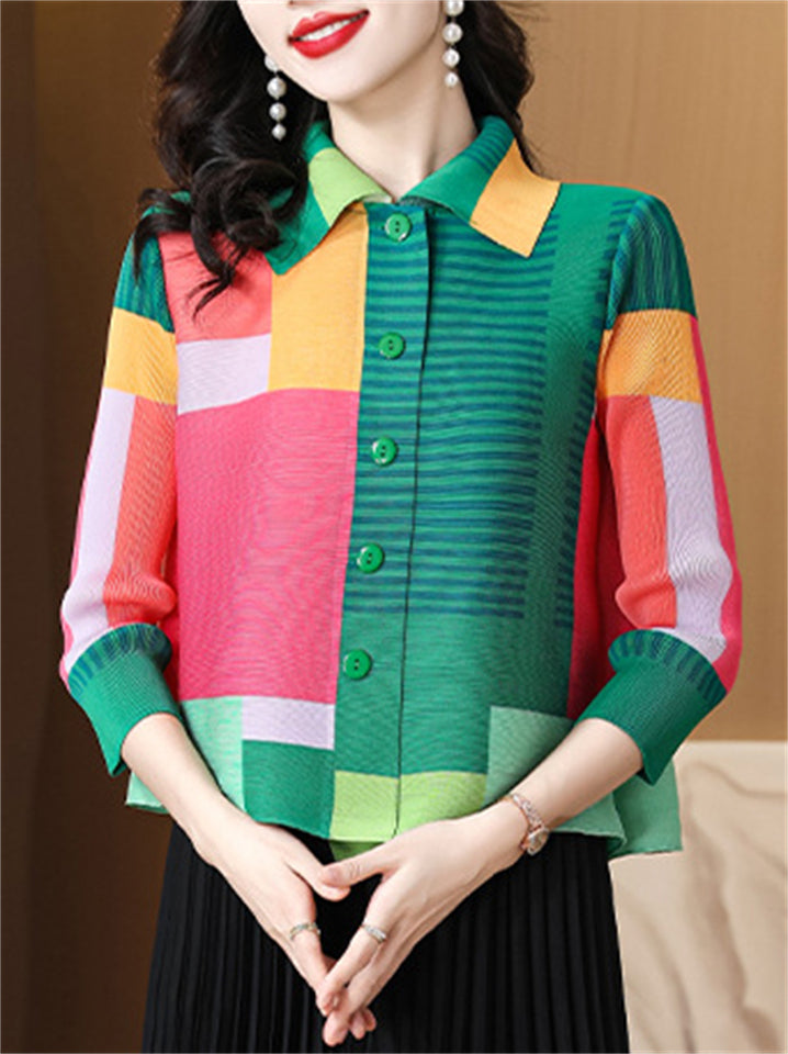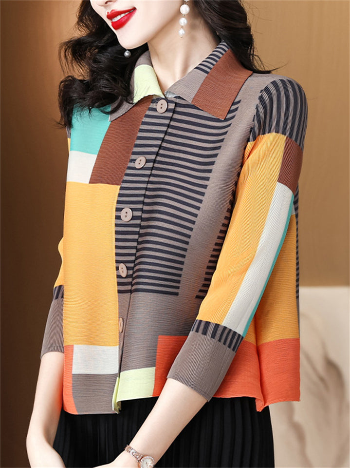 Female's One Size Elegant Striped Contrast Color Lapel 3/4 Sleeve Shirts