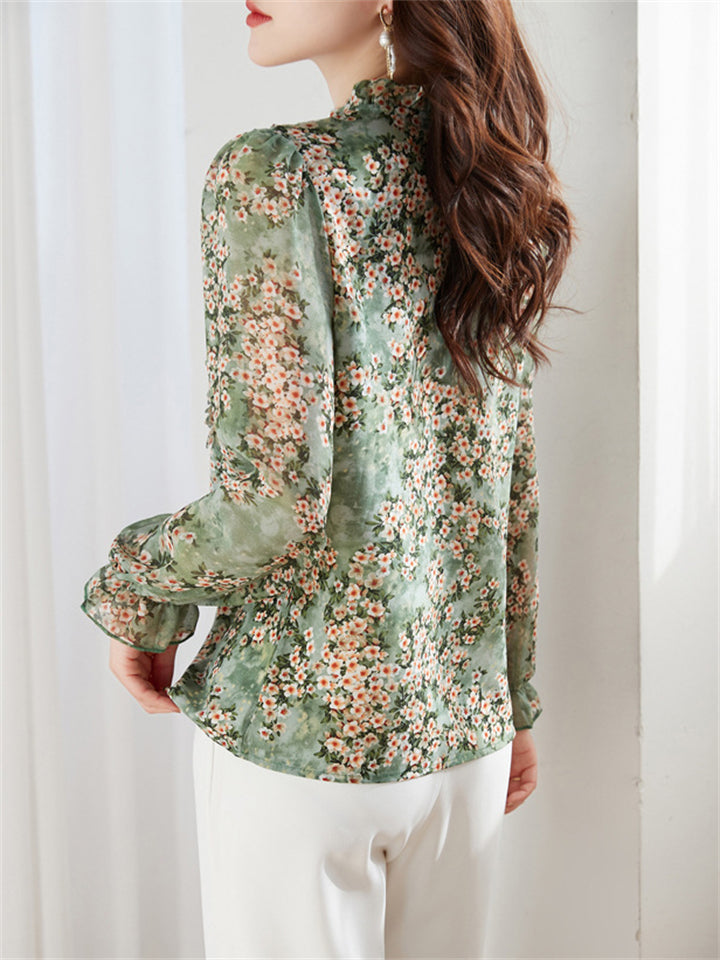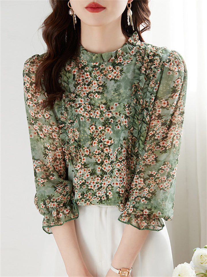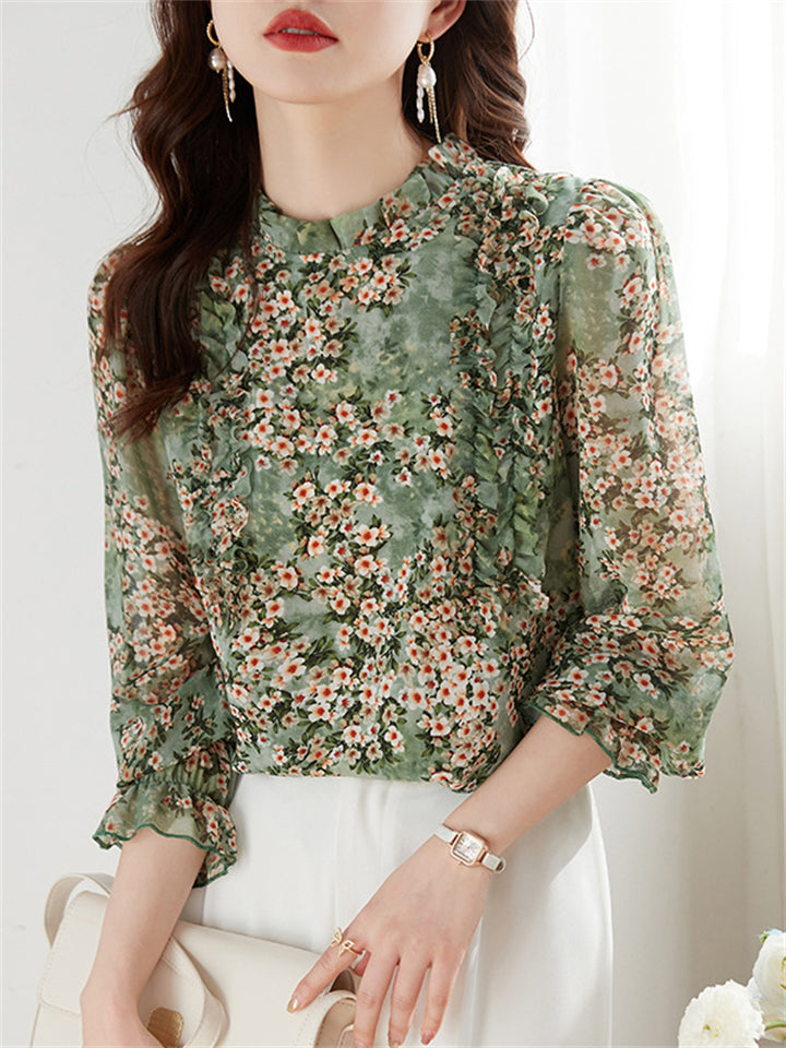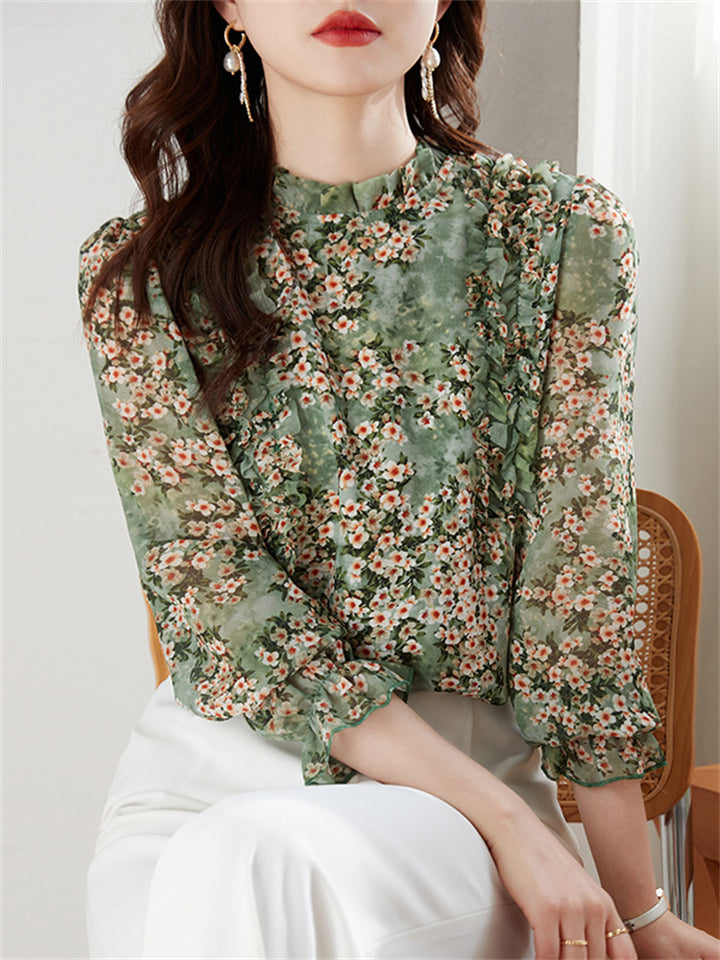 Floral Print Ruffle Trim Chiffon Shirt for Ladies