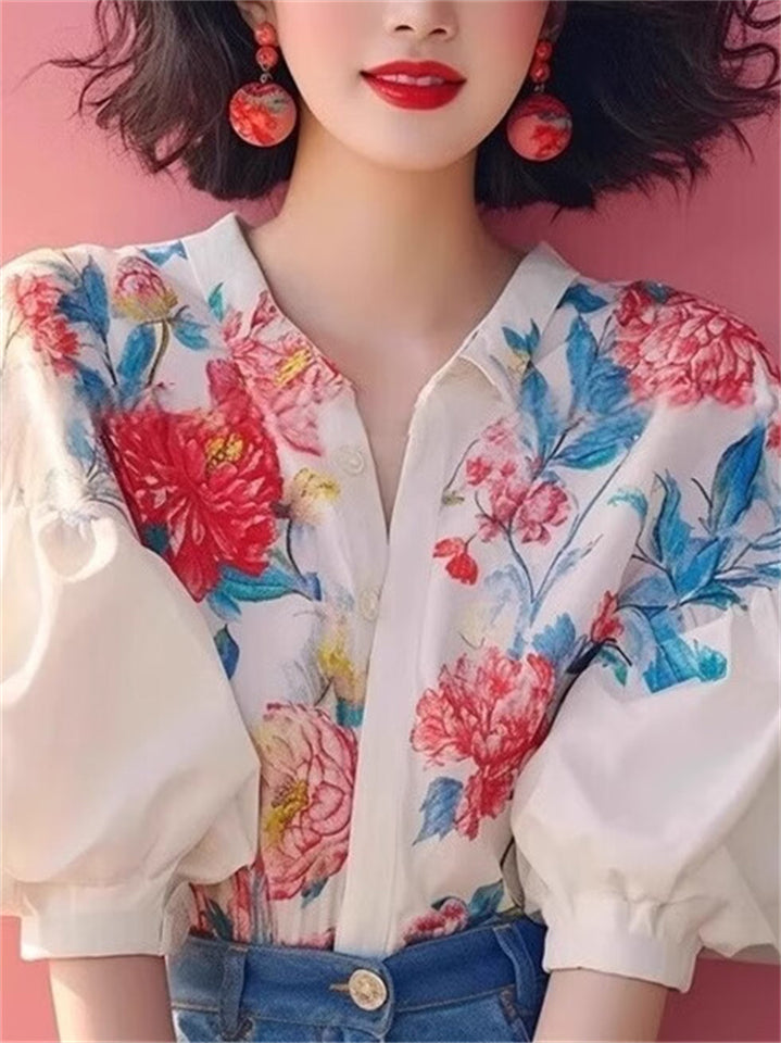 French Style Floral Print Puff Short Sleeve Shirt for Women