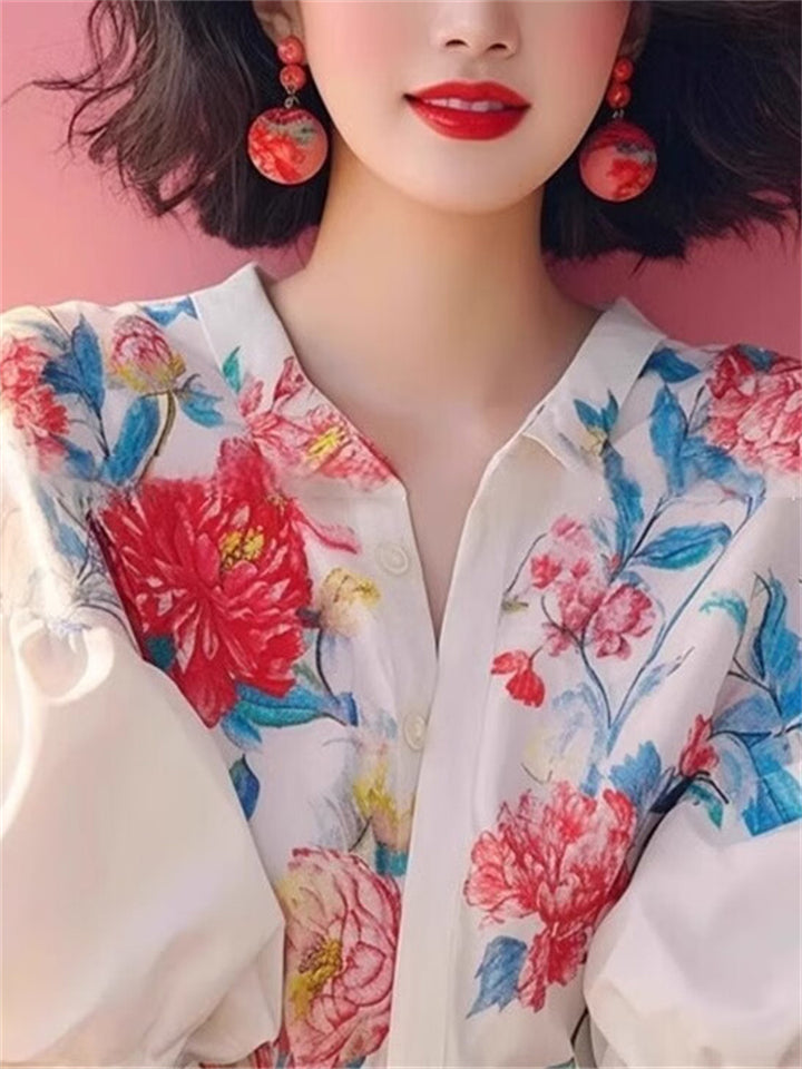 Women's Casual Retro Printed Long Sleeve Lapel Shirts