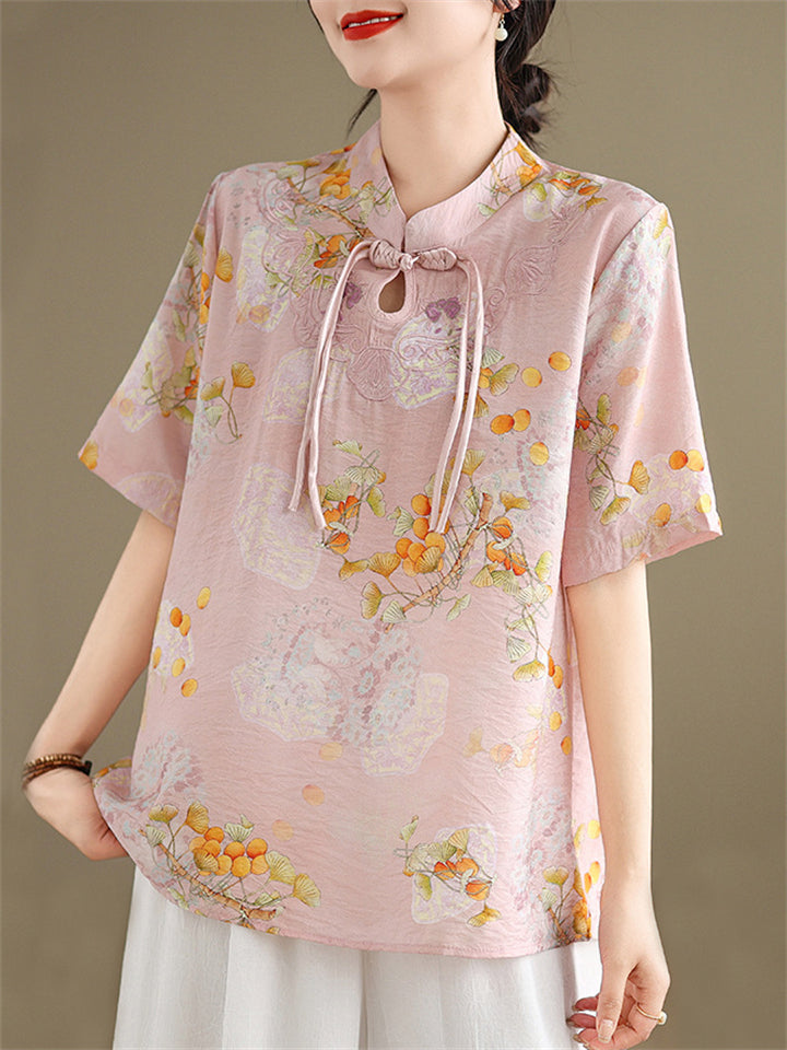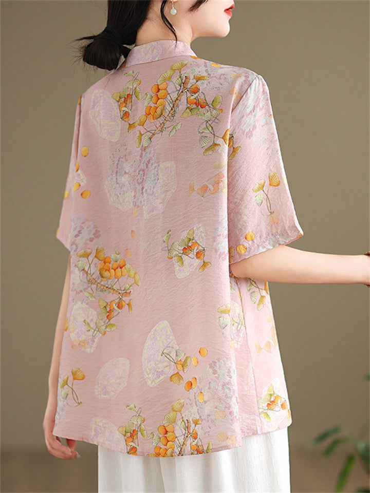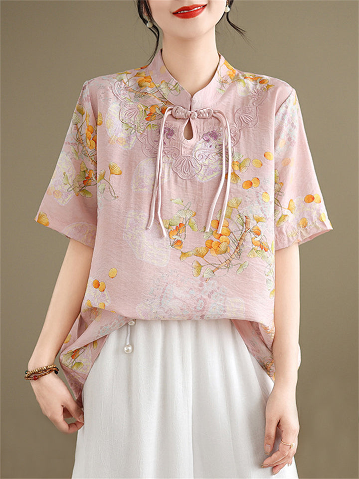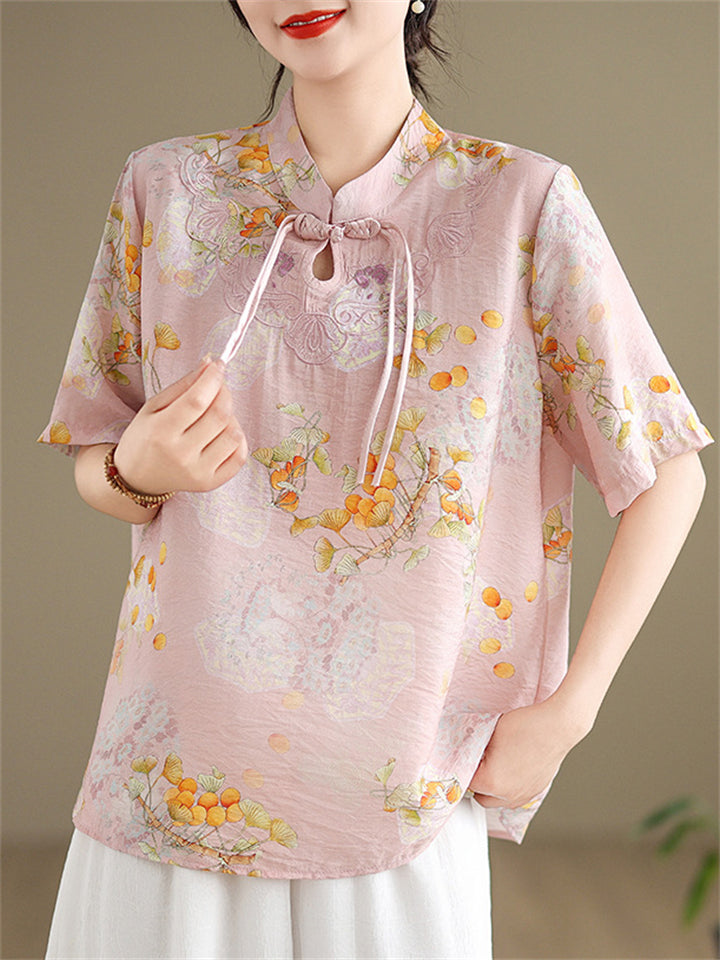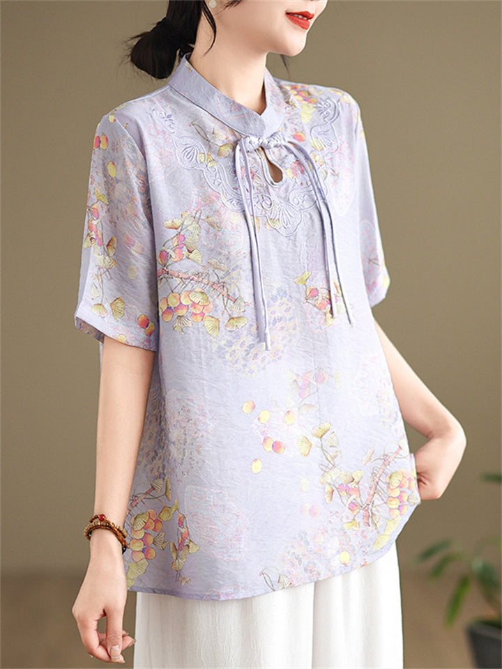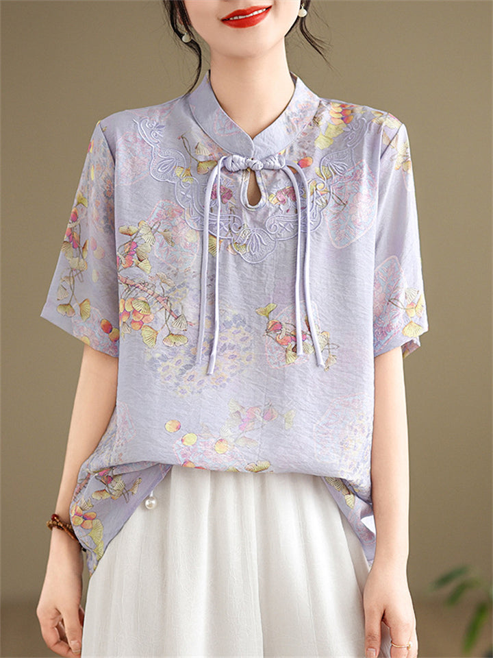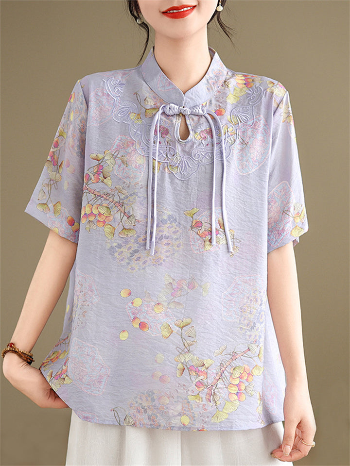 Lady Stand-up Collar Floral Printed Chinese Style Shirts