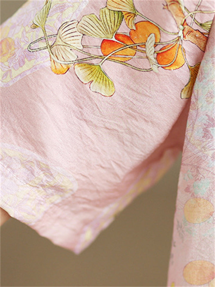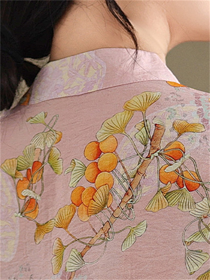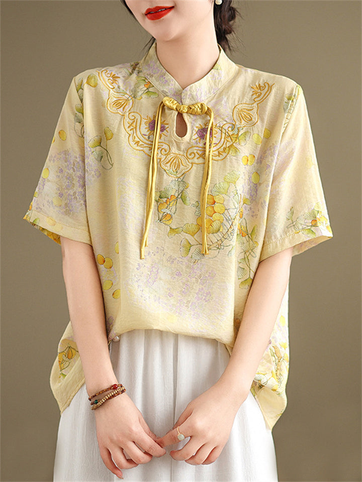 Ginkgo Leaf Print Stand Collar Tassel Button Female Shirt