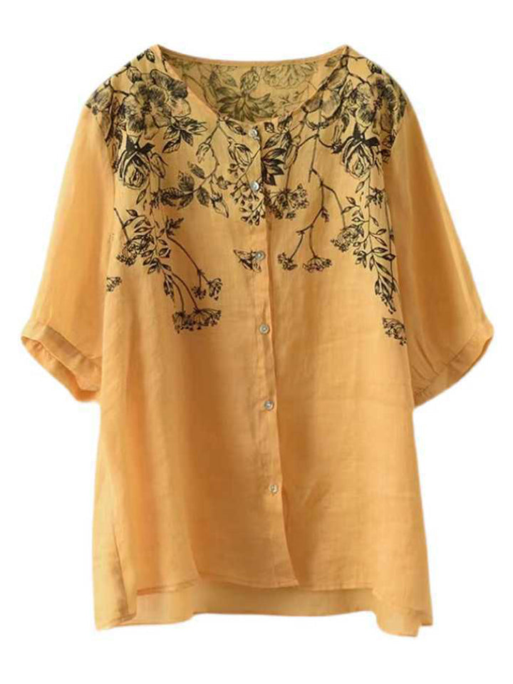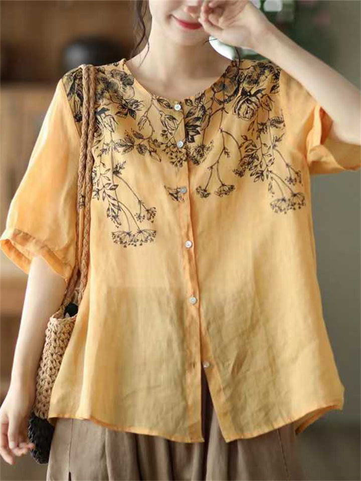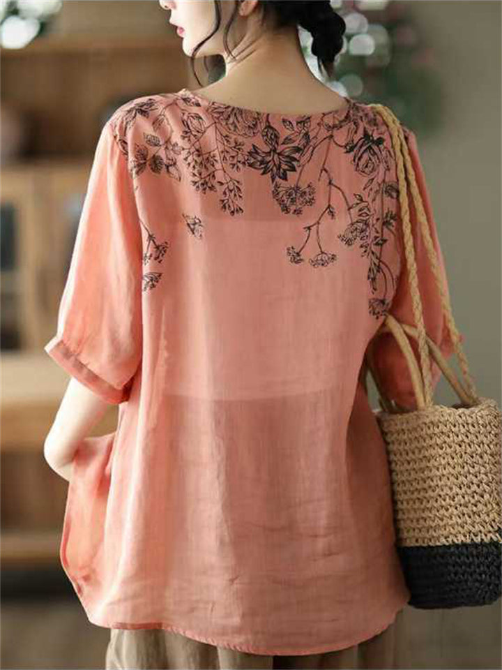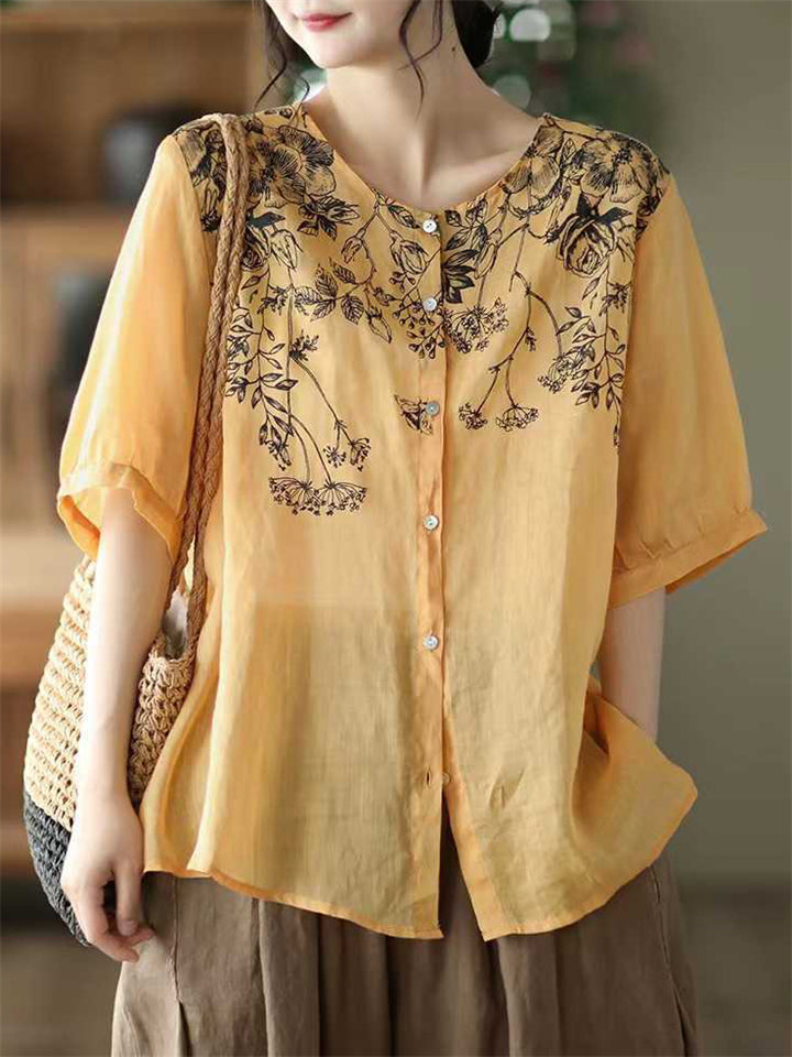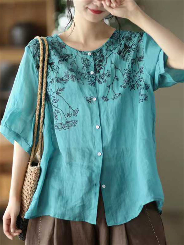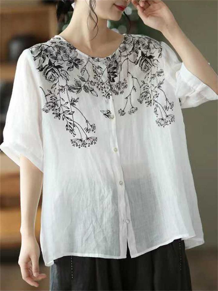 Ancient Chinese Style Floral Embroidery Linen Shirt for Women