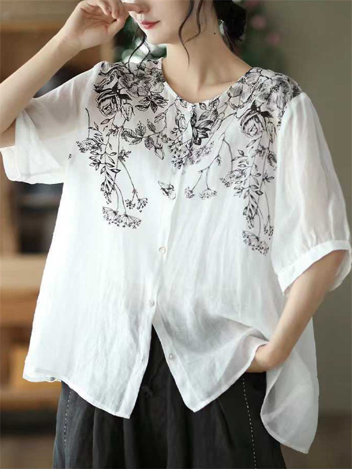 Women's Summer White Round Neck Embroidered Short Sleeve Shirts
