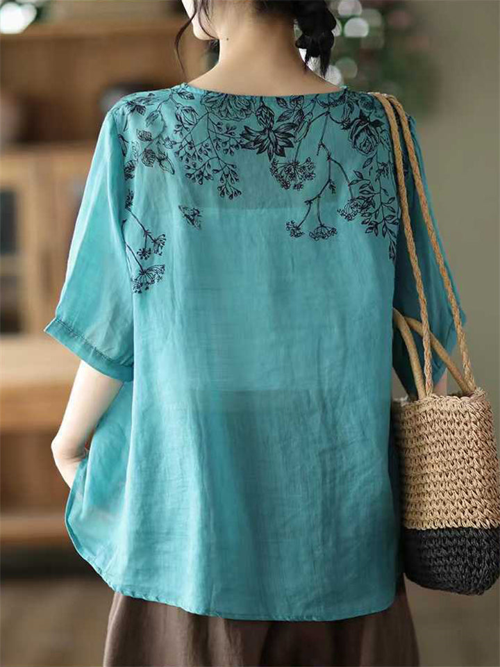 Ladies Ethnic Style Floral Embroidery Round Neck Shirts