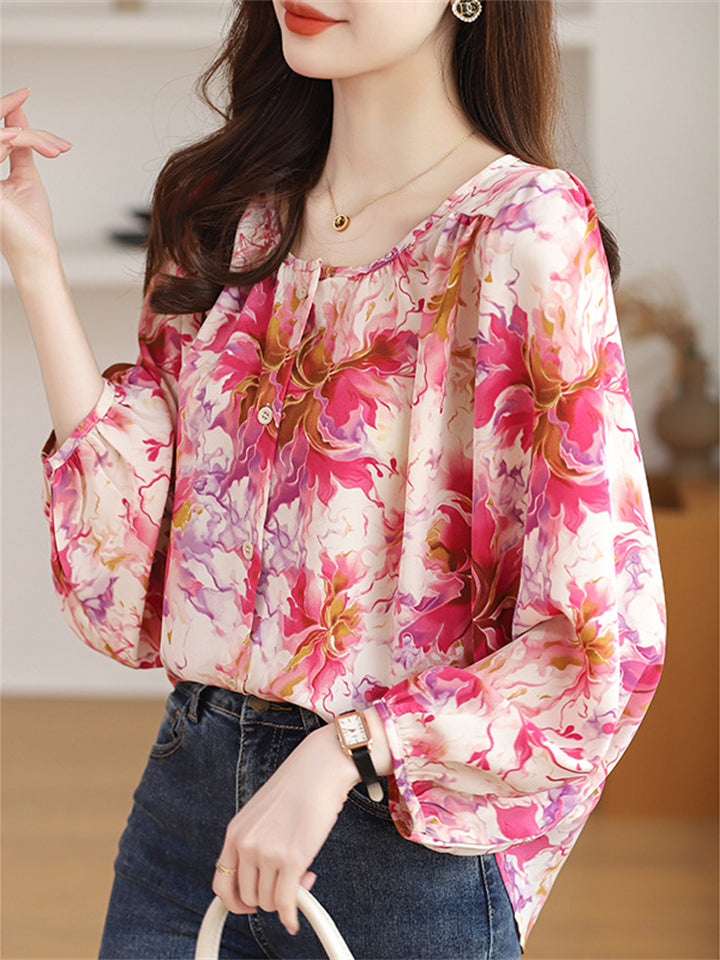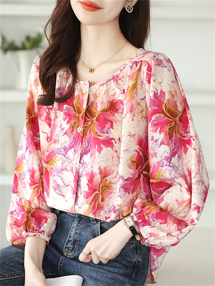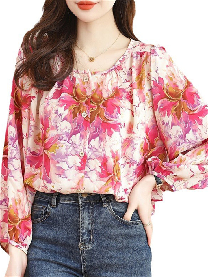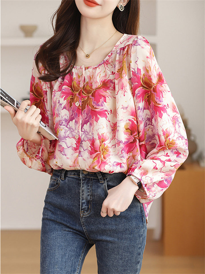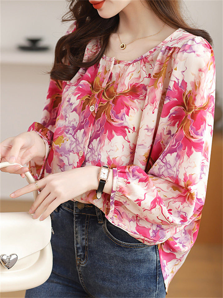 Korean Style Floral Print Round Neck Puff Sleeve Shirt for Women