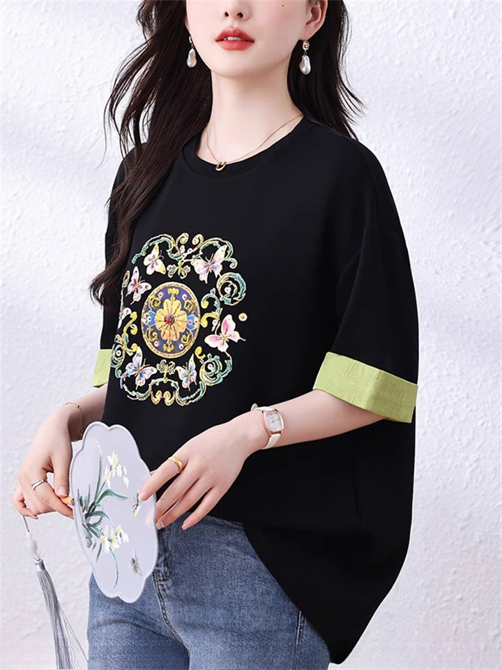 Ladies Ethnic Style Floral Embroidery Round Neck Shirts