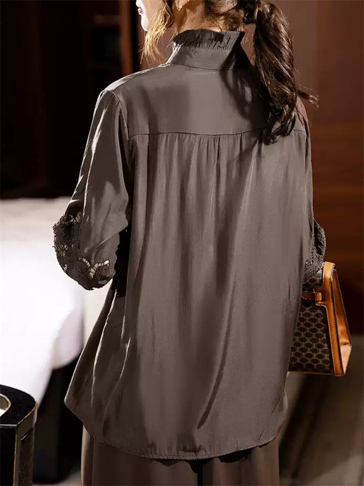 Women's Elegant Autumn Cotton Striped Hollow Stand Collar Long Sleeve Shirts
