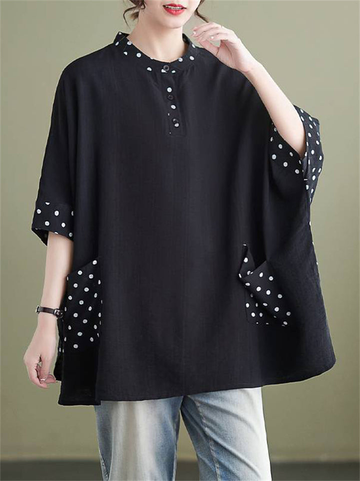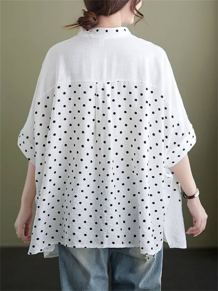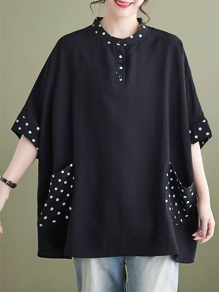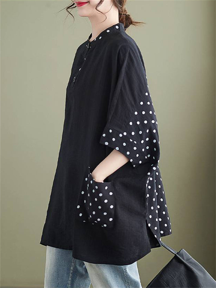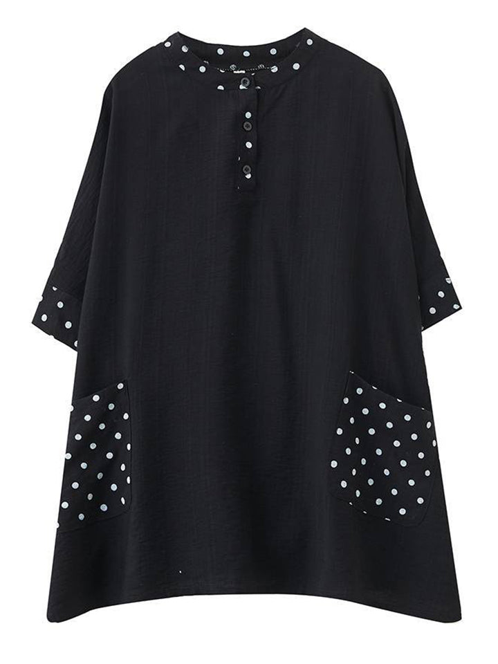 Ladies Round Neck Polka Dots Splicing Shirt with Pockets