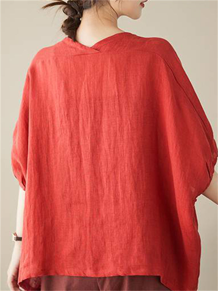 Women's Casual Retro Holiday Style Solid Color V Neck Short Sleeve Shirts