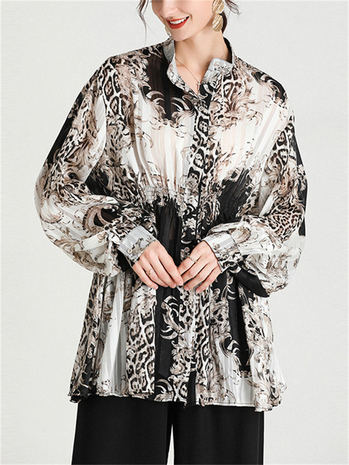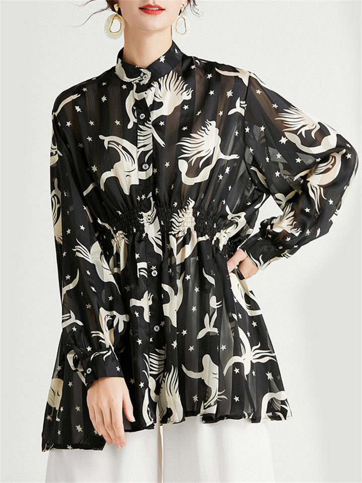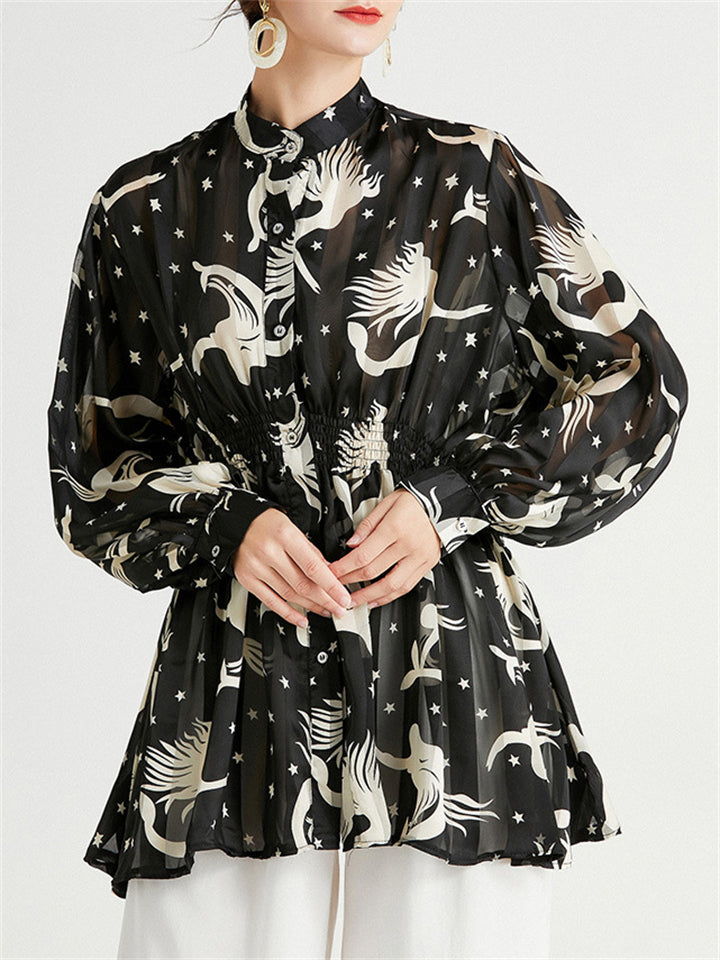 Lady Button Up Lantern Sleeve Printed Satiny Shirts