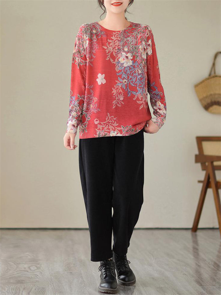 Ladies Ethnic Style Floral Embroidery Round Neck Shirts