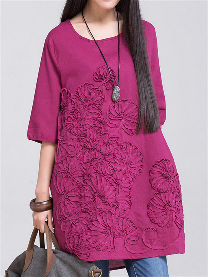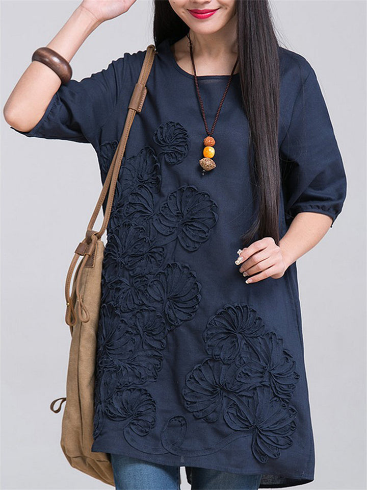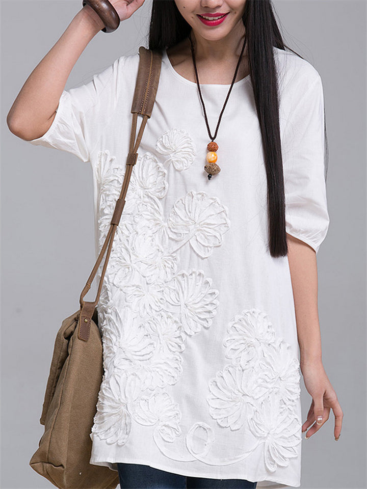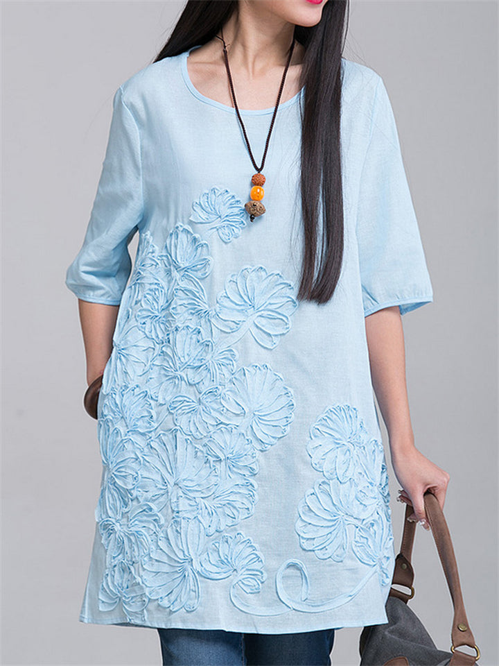 Ladies Ethnic Style Floral Embroidery Round Neck Shirts