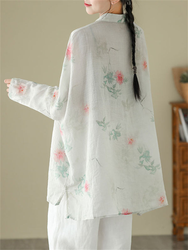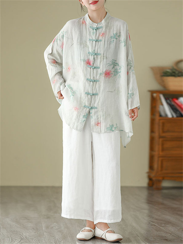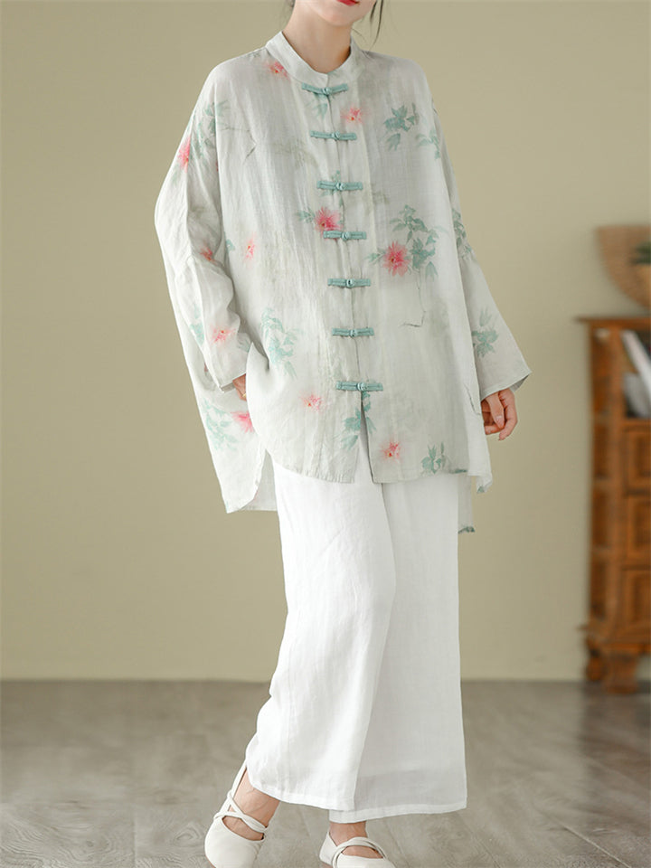 Ancient Chinese Style Floral Embroidery Linen Shirt for Women