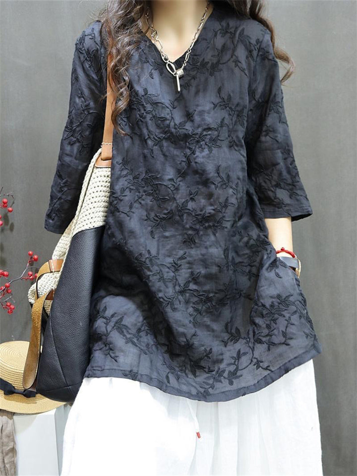 Ladies Ethnic Style Floral Embroidery Round Neck Shirts