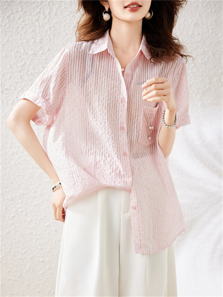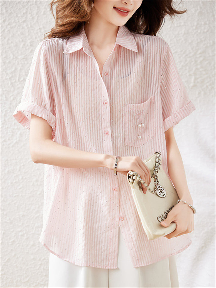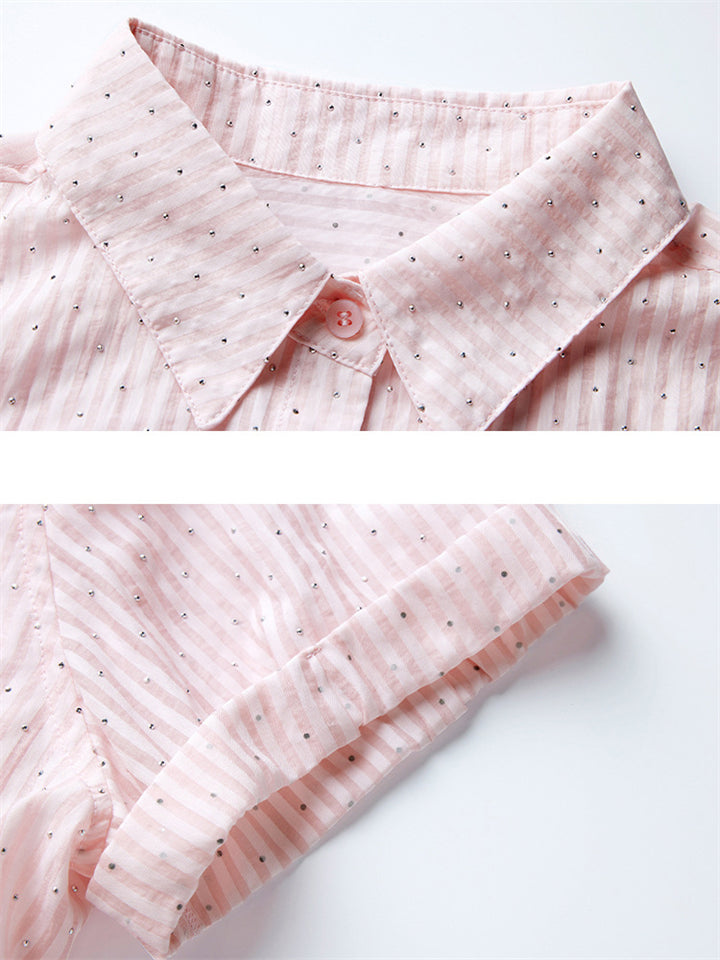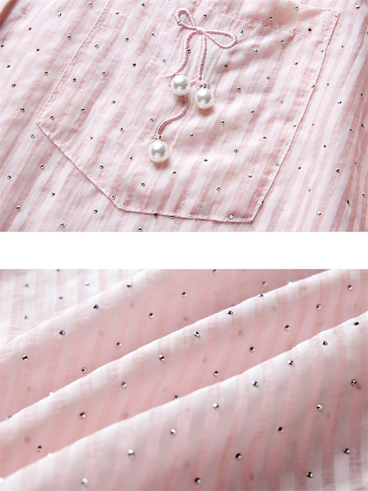 Light Pink Stripe Rhinestone Cozy Tencel Shirt for Women