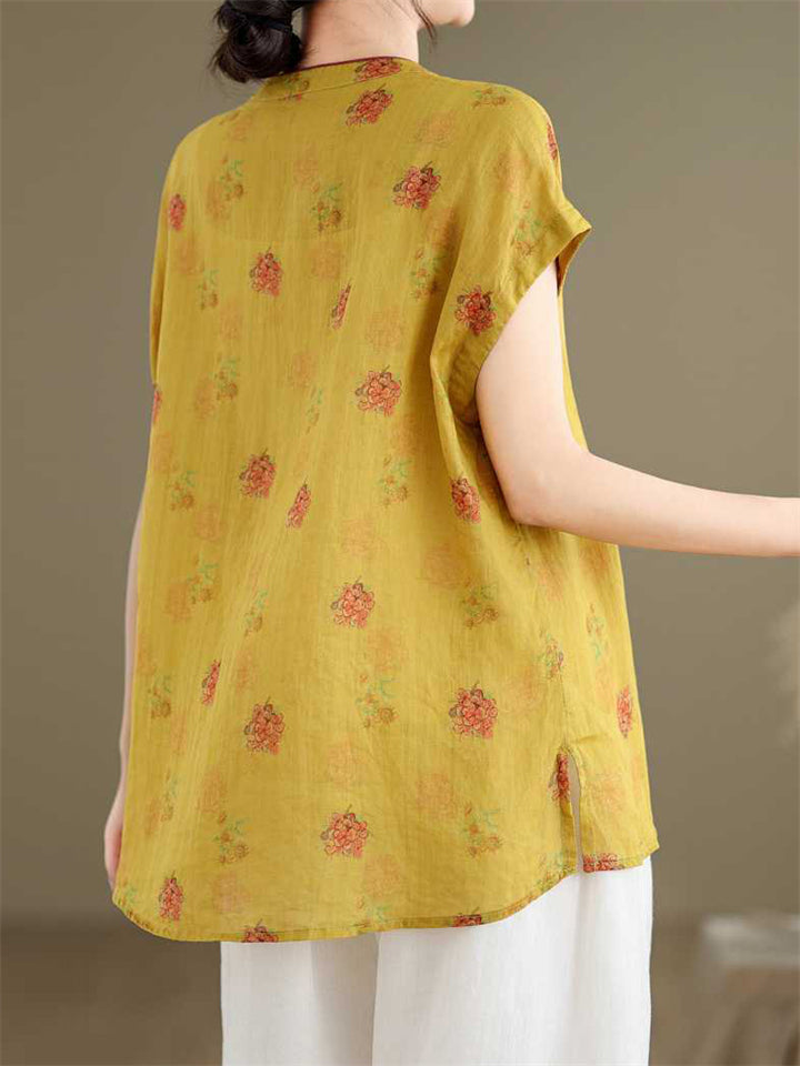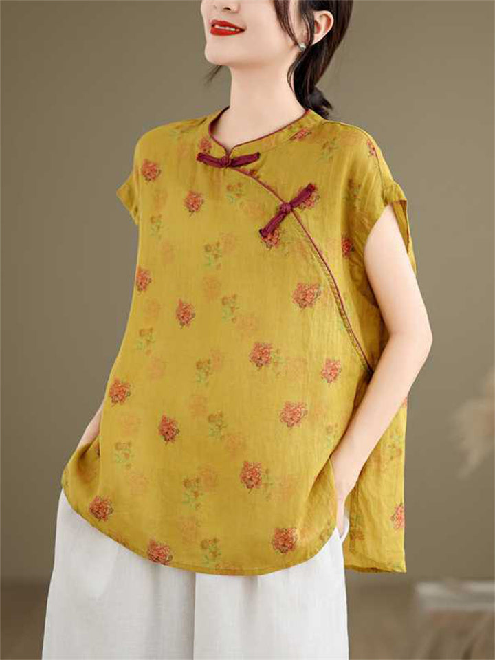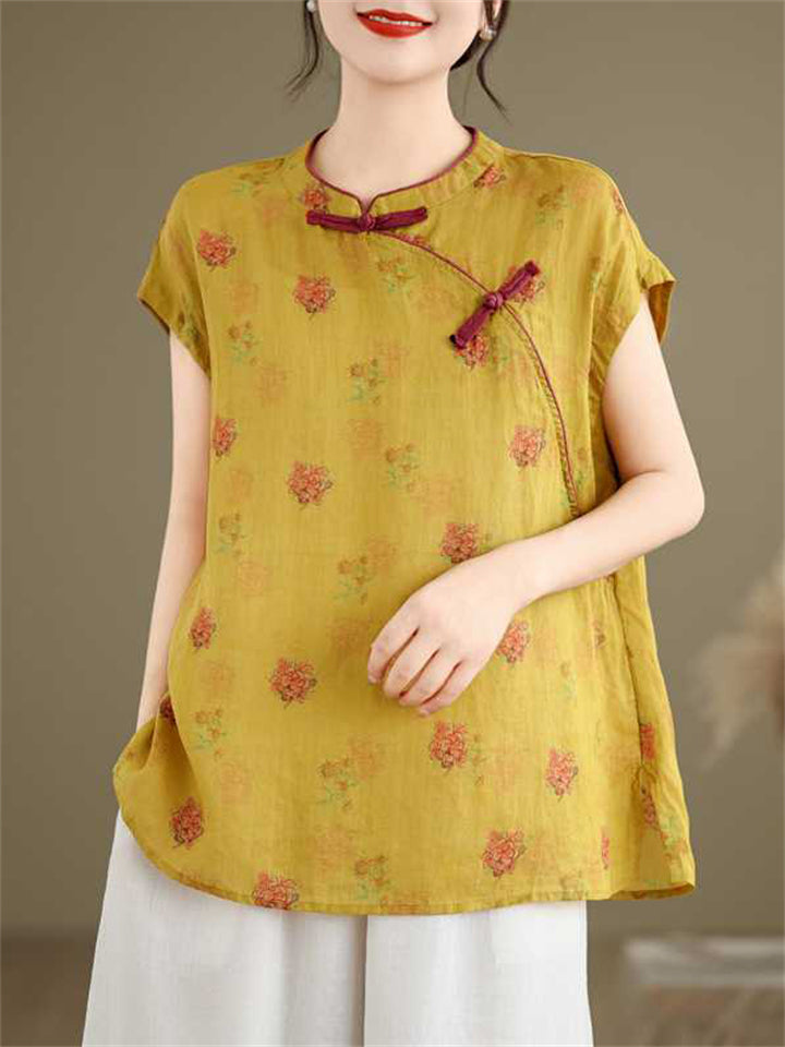 Lady Stand-up Collar Floral Printed Chinese Style Shirts