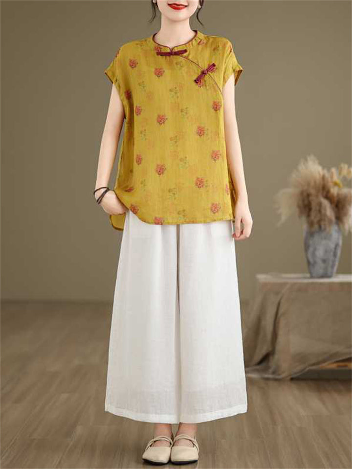 Ancient Chinese Style Floral Embroidery Linen Shirt for Women