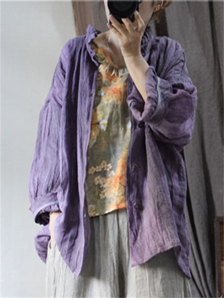 Loose Linen Distressed Textured Long Sleeve Shirt for Women