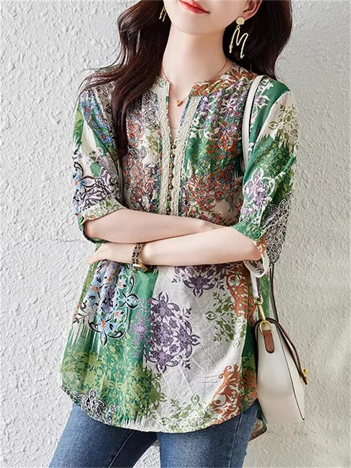 Summer Bohemian Style V Neck Print Vacation Shirt for Women