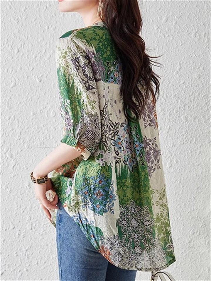 Loose Summer Floral Print V-Neck Patchwork Shirt For Women