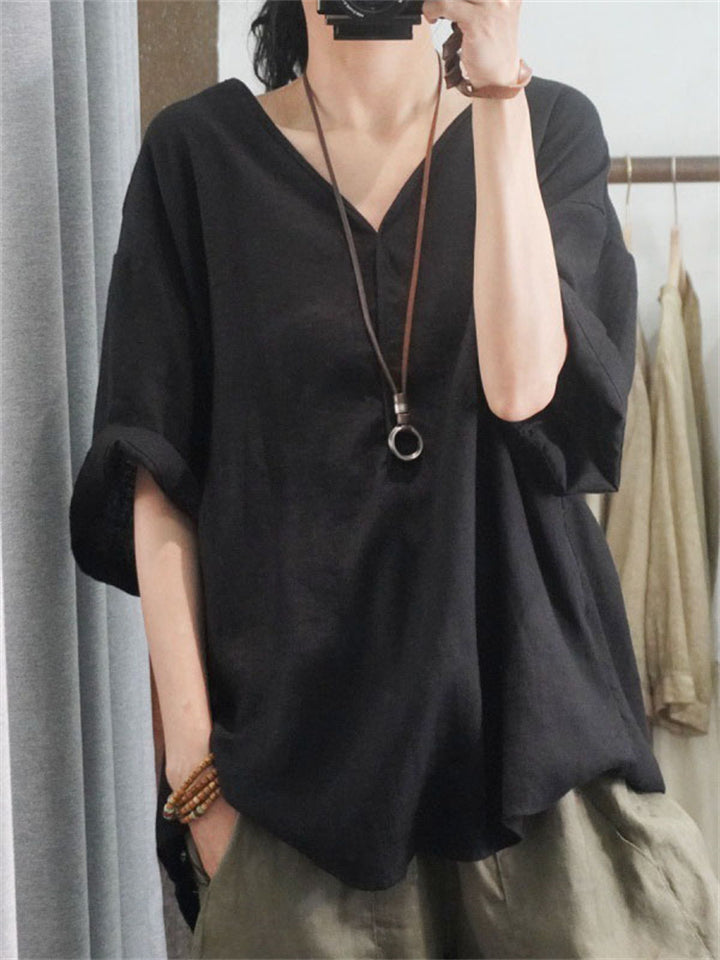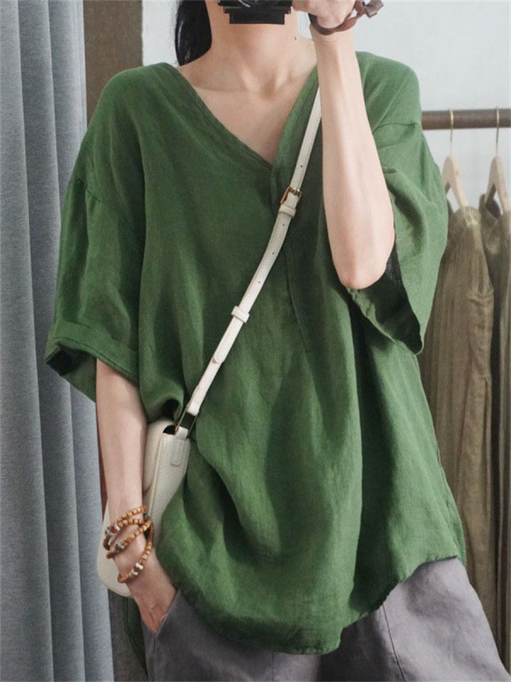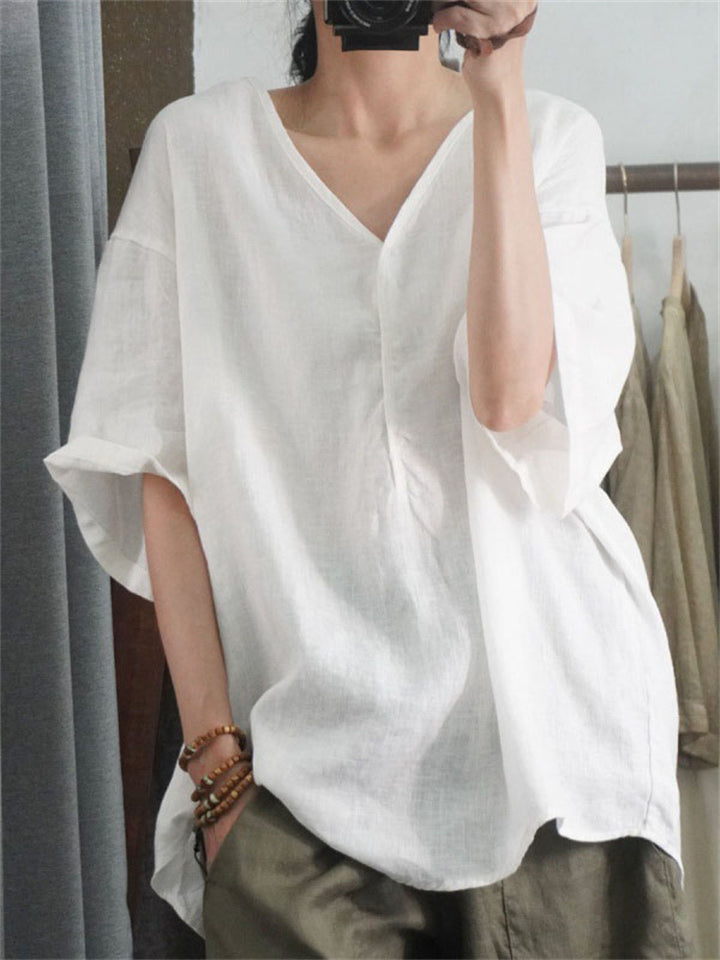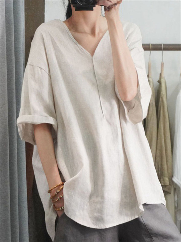Loose V Neck Half Sleeve Breathable Simple Linen Shirt for Women